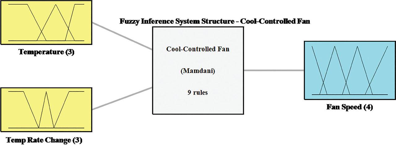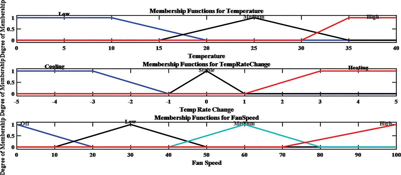 In the cool-controlled fan system, the FIS considers the Temperature and the Temperature Rate of Change. The Temperature input ranges from [0, 40] [0, 40] [0, 40] with the following membership functions: Low, Medium, and High. The Temperature Rate of Change is within [−5, 5] [−5, 5] [−5, 5], represented by the following membership functions: Cooling, Stable, and Heating.