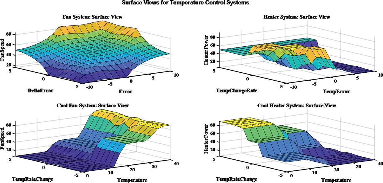 The top-off-right plot depicts the impact of the temperature change rate and temperature error on heater power. The left plot displays the mold of the temperature rate change and temperature on fan speed, while the bottom plot illustrates the effect of the temperature rate change and temperature on heater power. These plots are necessary for understanding the controller’s response to unusual error and value of transfer conditions.