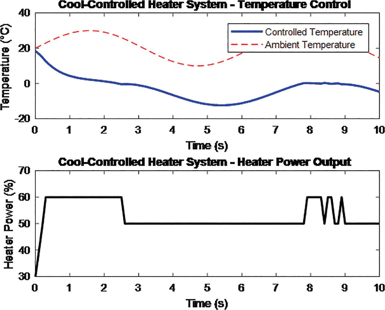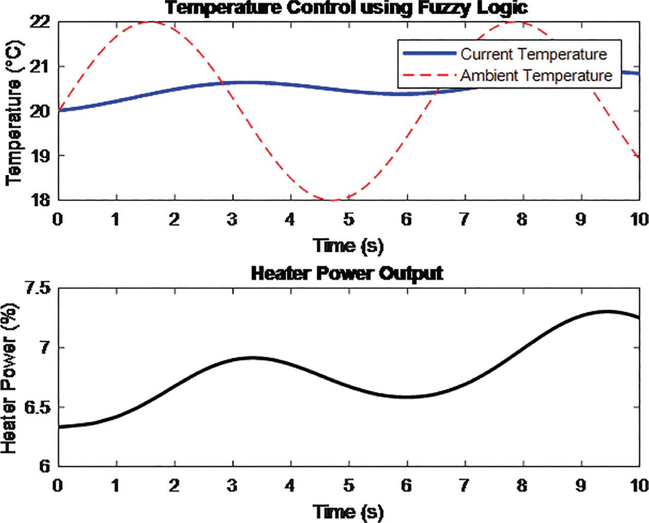 The plots in Figure 18 demonstrate the performance of a cooling heater system regulated by a FLC. The top off chart shows the comparison between the controlled temperature (solid bluing line) and the ambient temperature (dashed red line) over a period of 10 s. The ambient temperature starts at about 22°C and fluctuates somewhat above and under this value.