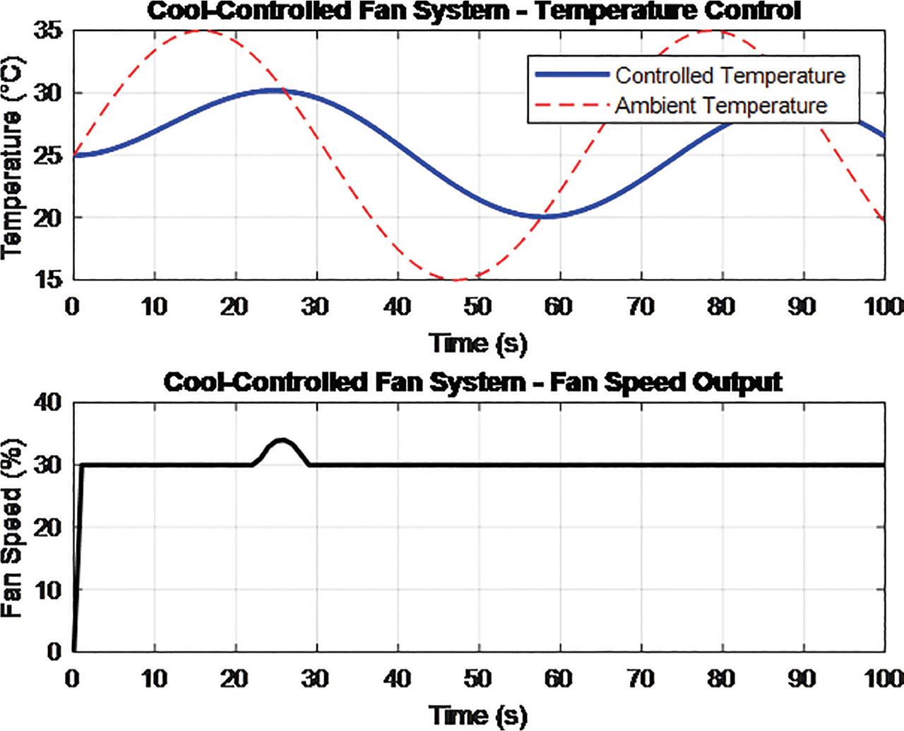 The plots in Figure 17 depict the performance of a cooling system restricted by an incoherent logic controller. The top graph compares the restricted temperature (solid bluing line) and the ambient temperature (dashed red line) over a 100-s period. The close temperature fluctuates around 25°C, varied between 15°C and 35°C in a sinusoidal pattern. Despite these substantial fluctuations in ambient temperature, the controlled temperature remains relatively stable, primarily oscillating between 23°C and 28°C. This suggests that the fuzzy system of a logic controller effectively moderates the temperature changes, maintaining it inside a more affected range than the ambient conditions.