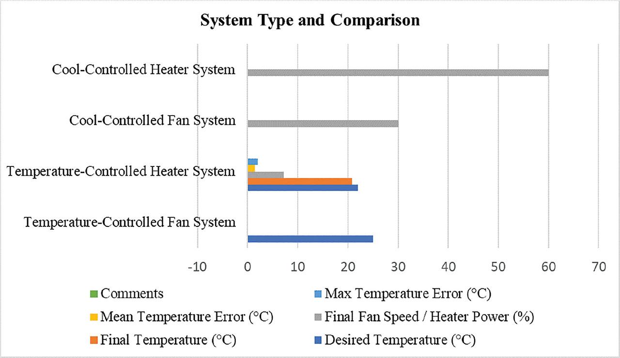 | Comments on results | Maintains target temperature with minimal overshoot. Effective for precise cooling and slightly needed for error correction | Maintains temperature close to desired with minor deviations. Suitable for stable heating and requires minor fine-tuning | Efficiently maintains a cooler environment than ambient. Ideal for cooling applications with consistent control | Effectively prevents overheating by adjusting heater power. Suitable for strict temperature control and could improve energy efficiency |