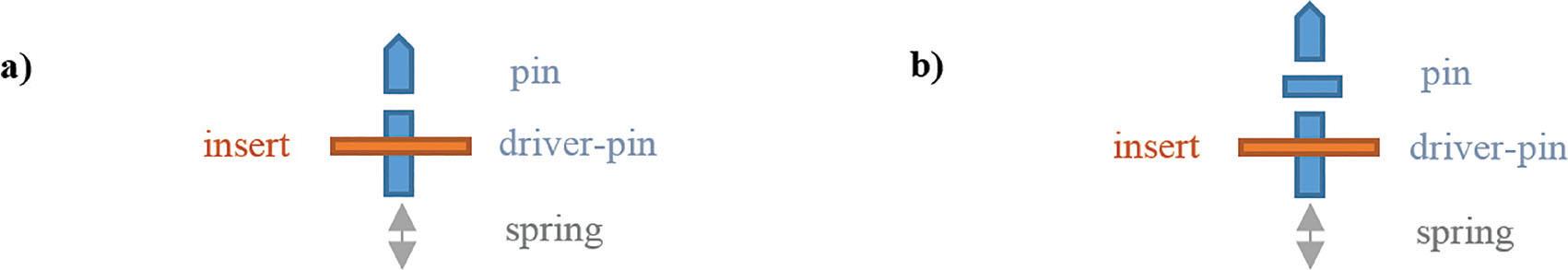 Examples of pin organization in a mechanical lock a) with one opening key b) with two opening keys.