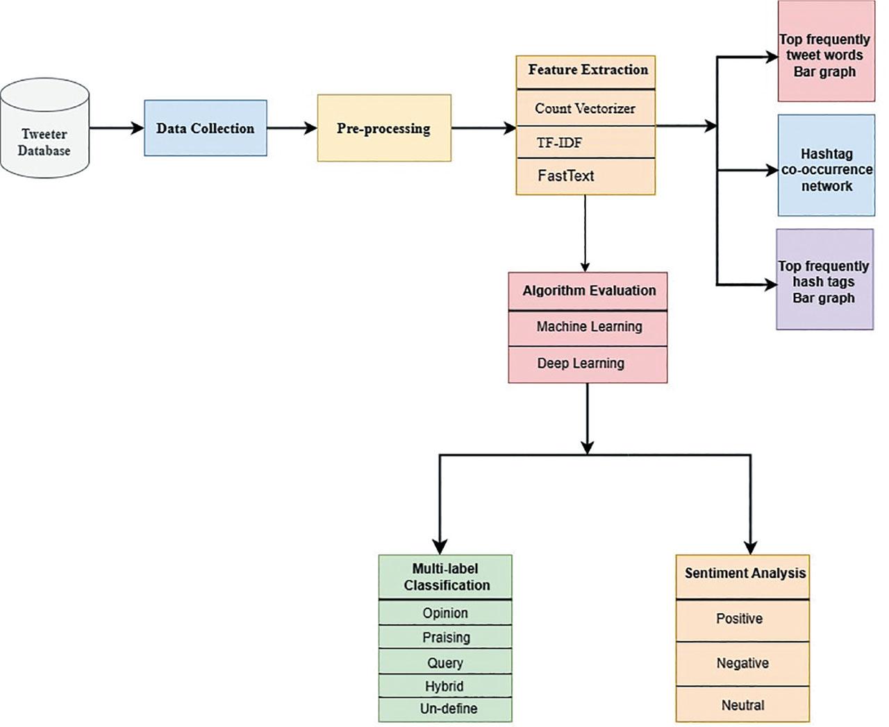 Initially, three feature extraction techniques were used: count vectorizer, TF-IDF, and FastText. After this process, various machine learning and deep learning algorithms were applied to identify the labels of tweets: opinion, praise, query, hybrid, or undefined. Additionally, the emotion polarity scores of the tweets were assessed, indicating their sentiment as positive, negative, or neutral. In this research, machine learning and deep learning algorithms evaluated the sentiment of each word included in users’ tweets on Twitter.
