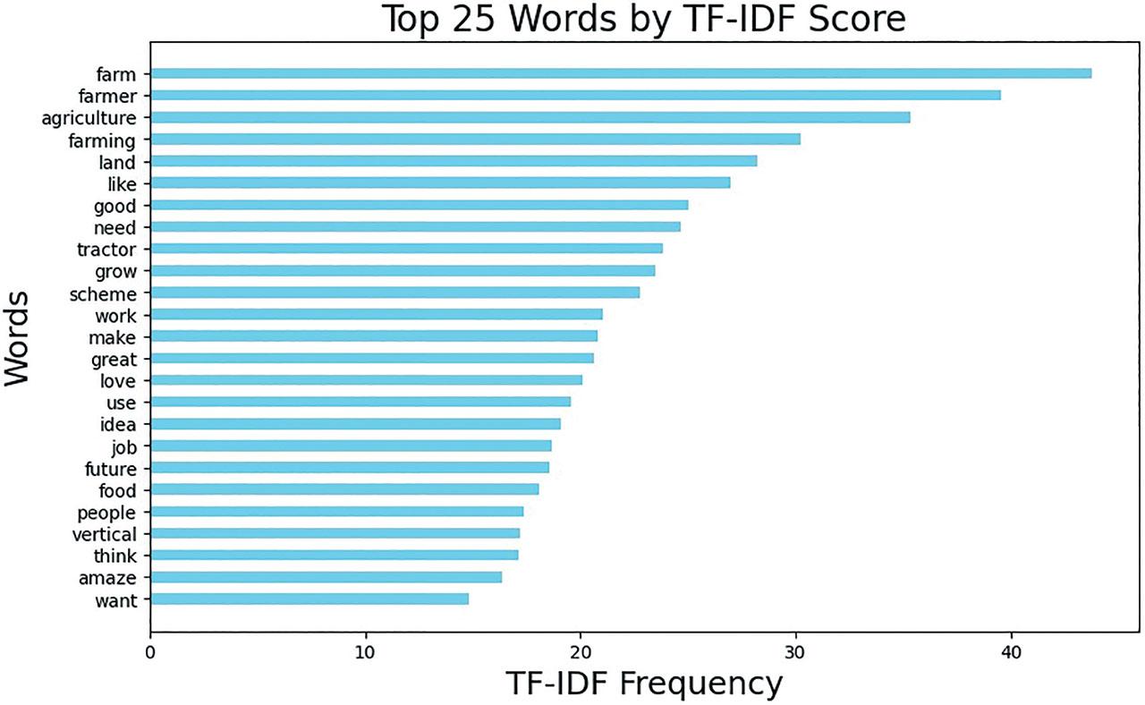 Figure 3 presents the most frequently used terms in conversations among agriculturalists and provides a summary plot of the top 25 words based on their frequency. The x-axis shows the TF-IDF score, while the y-axis lists the words ranked by their TF-IDF values. Figure 3 also indicates that “farm” has the highest TF-IDF frequency, followed by “farmer,” “farming,” “agriculture,” “land,” and others. This suggests that the collected tweets from Twitter predominantly focus on topics related to agriculture.