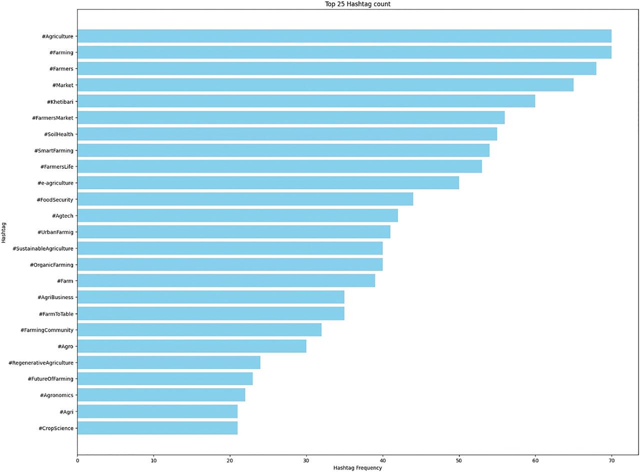 This research also identified the top 25 most frequent words and hashtags related to agriculture, indicating that the tweets primarily focus on discussions around agriculture-related activities and operations.