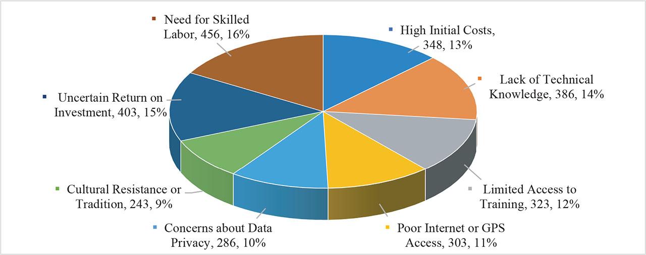 Figure 5 presents a pie chart illustrating the primary challenges in the adoption of new farming technologies. These challenges include high initial costs (13%), lack of technical knowledge (14%), limited access to training (12%), poor internet access or GPS access (11%), concern about data privacy (10%), cultural resistance or tradition (9%), uncertain return on investment (15%), and the need for skilled labor (16%). These data highlight that the need for skilled labor is the most significant challenge, followed by uncertain return on investment, lack of technical knowledge, high initial costs, limited access to training, poor internet access or GPS access, concern about data privacy, and cultural resistance or tradition.