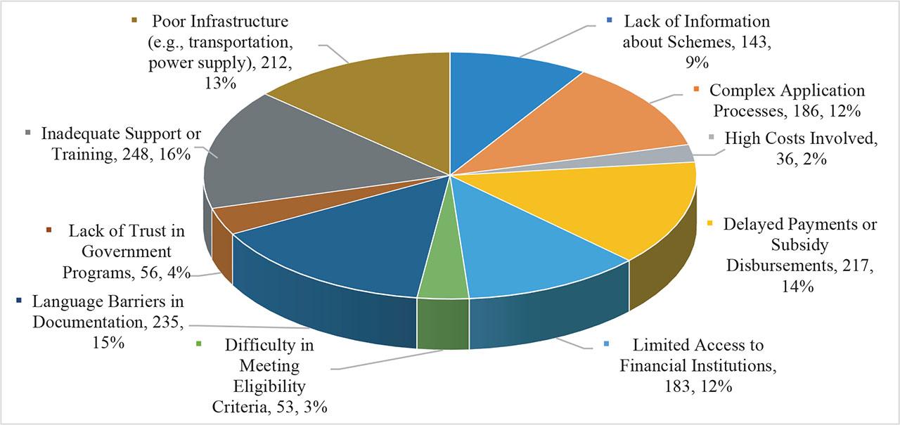 Figure 6 illustrates a pie chart of key challenges in the adoption of farming schemes. These challenges include the lack of information about schemes (9%), complex application processes (12%), high costs involved (2%), delayed payments or subsidy disbursements (14%), limited access to financial institutions (12%), difficulty in meeting eligibility criteria (3%), language barriers in documentation (15%), lack of trust in government programs (4%), inadequate support or training (16%), and poor infrastructure (e.g., transportation, power supply) (13%). The data reveal that the most significant challenge is inadequate support or training, followed by language barriers in documentation, delayed payments or subsidy disbursements, poor infrastructure (e.g., transportation, power supply), complex application processes, limited access to financial institutions, lack of information about schemes, lack of trust in government programs, and high costs involved.