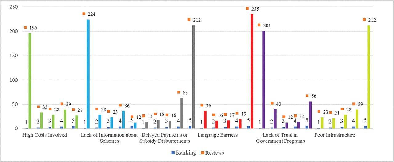This paper examines farmers’ perspectives on some key challenges related to adopting new farming technologies and schemes, as depicted in Figures 7 and 8, respectively. Farmers rated these challenges on a scale of 1–5 (1 = Not a Challenge, 5 = Major Challenge). Figure 7 highlights farmers’ rating in adopting new farming technologies, with the need for skilled labor being the most significant, followed by limited technical knowledge, inadequate internet or GPS access, and high initial costs. In Figure 8, the ratings of farmers in adopting farming schemes are shown to include language barriers as the most pressing issue, followed by delayed payments or subsidy disbursements, poor infrastructure, lack of trust in government programs, high costs, and limited information about available schemes.