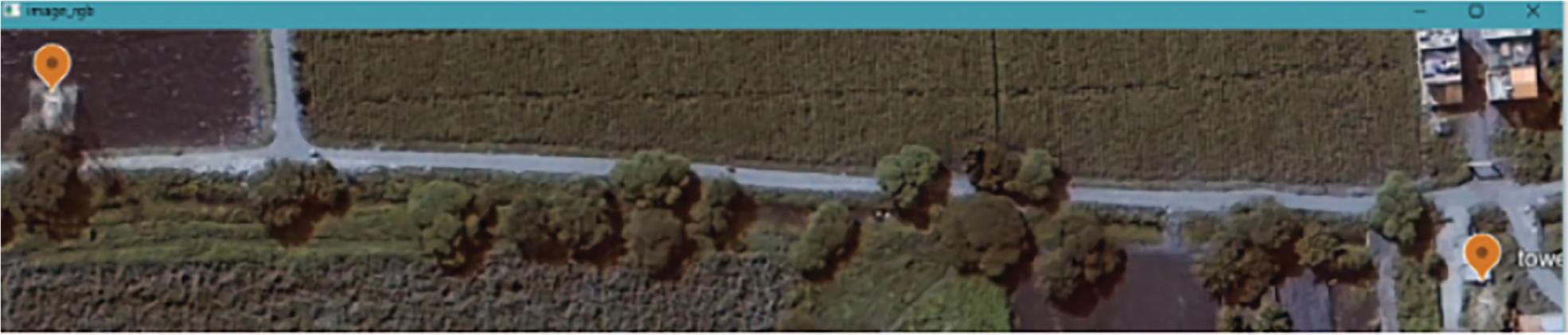 ROI extraction: The GEE_initial image from which one captured imagery was likely much wider than just the grid line corridor. To solve this, we used image cropping techniques based on OpenCV (OpenCV.org and open-source community), a widely used library for computer vision tasks. It accurately cropped out the pixels in the wide field of view image to only those pixels that contained the narrow vertical corridor between the power towers. The defined image was set to a narrow aspect ratio to prevent focusing on anything but the ROI for monitoring vegetation encroachment. Figure 1 shows the data preprocessing ROI extraction by cropping. The satellite images one receives from GEE might have been in Red, Green, Blue (RGB) color space. RGB is fine for visualization but not necessary for vegetation. Therefore, a conversion to gray scale was used. Figure 2 demonstrates color conversion from RGB to gray scale. The data were then transformed into a 1D array of pixels with each pixel being represented by a single number for intensity to remove redundant color information.