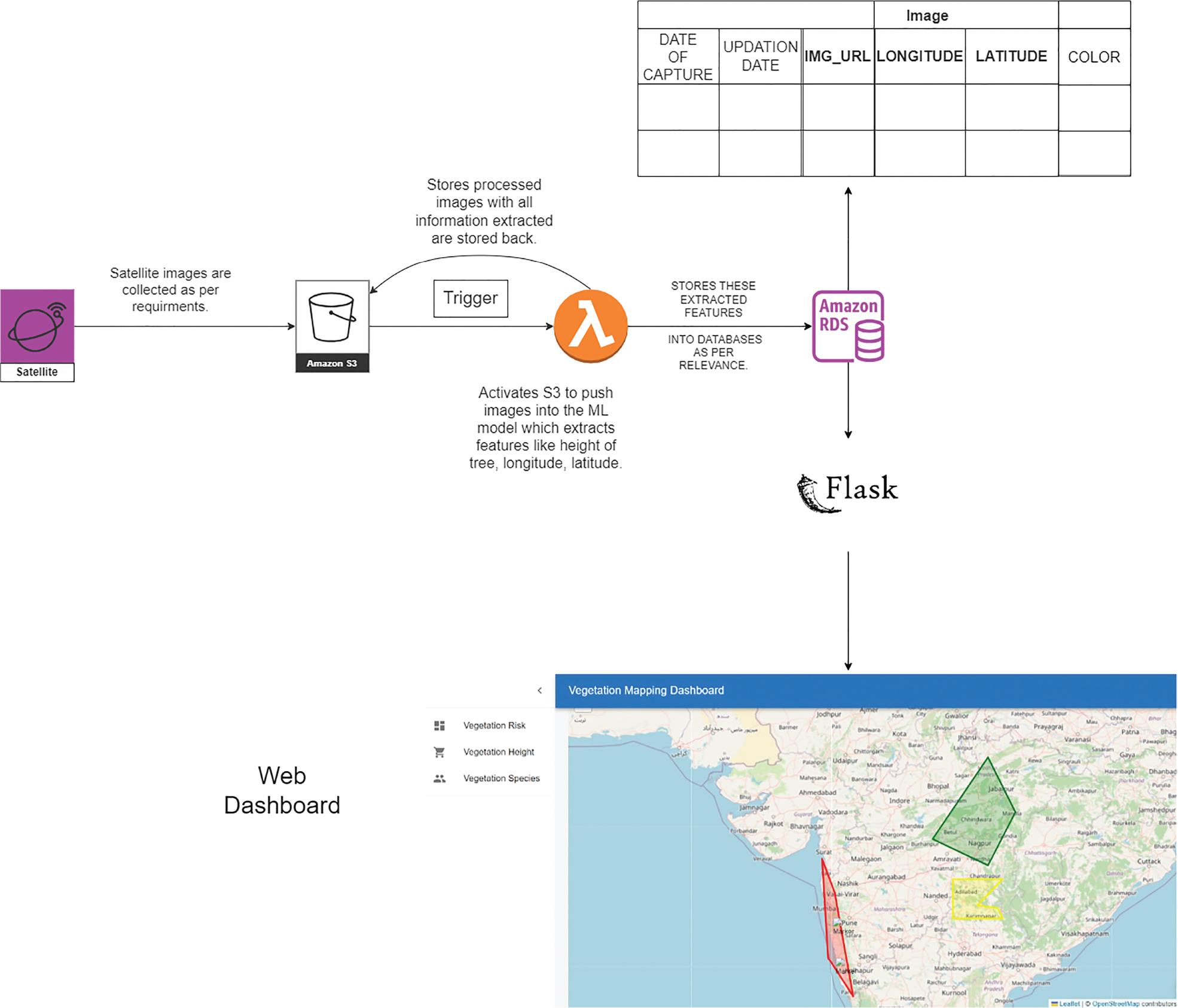The final stage of this research involved effectively deploying the developed system, culminating in a dynamic web dashboard for vegetation encroachment monitoring. To achieve this, we embraced a serverless approach, leveraging the power of AWS Lambda for image processing and data storage. This deployment strategy offered several advantages, including scalability, cost-efficiency, and streamlined maintenance. When a satellite image is uploaded to an S3 bucket, the Lambda function extracts meta-data (e.g., size and timestamp) and stores it in an RDS database.