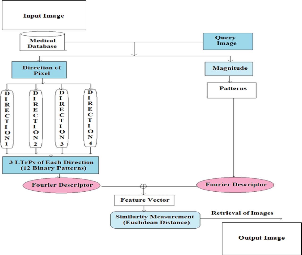 Valizadeh and Babapour Mofrad [6] researched textured image recovery, and an approach involving the Fourier descriptor and local tetra pattern was suggested. By considering the vertical and horizontal directions that are determined via first-order derivatives, the method establishes an association with the center pixel and its neighbors. The most important aspect of an image is its texture characteristic, which filters out images that are more suited in relation to the input image. Figure 1 shows the architecture of their work. They also investigated the relationship between local ternary patterns (LTP) [7, 32] and the Euclidean distance [8]. They used a dataset of retinal images labeled with grades of macular edema and retinopathy. Based on the mean values of the real and imaginary parts of complex numbers of polar coordinates in the frequency domain, the Fourier transform is utilized to produce the feature vectors. The boundaries and modeling of objects may benefit from the use of shape-based Fourier descriptors.