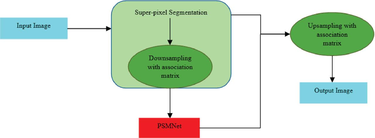 Yang et al. [10] reported that the use of superpixels is an effective method for reducing the number of image fundamentals needed for further processing. Figure 2 shows the overall architecture of their work. The images were first segmented via a fully convolutional network superpixel segmentation, and then the acquired features were input into PSMNet. However, fewer researchers have used them with DNNs. The fact that superpixel renders the conventional convolution process ineffective when used on conventional layouts is one of the primary causes [11]. Guided by a standard initialization technique used by superpixel algorithms, they proposed a new approach that estimates superpixels on a conventional image layout via a DNN [12, 13]. They achieved a speed of more than 50 frames per second and achieved good results over large datasets. Based on the obtained superpixel, they designed a down-sampling/up-sampling strategy to obtain good results.