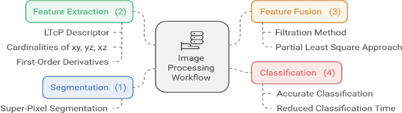 The images were segmented using superpixel segmentation, followed by feature extraction with the Local Tetra Patterns (LTcP) descriptor based on composite planes (xy, yz, and xz). First-order derivatives were used to detect neighborhood and center pixels. The extracted features were then fused using a filtration method and PLS, reducing the number of features needed for accurate classification and minimizing processing time. Figure 3 illustrates the overall architecture from data collection to results. The phases are numbered from 1 to 4. After segmentation, the features are extracted, and the optimal features are fused. These fused features are fed to the classifiers to give accurate results within reduced computational time.