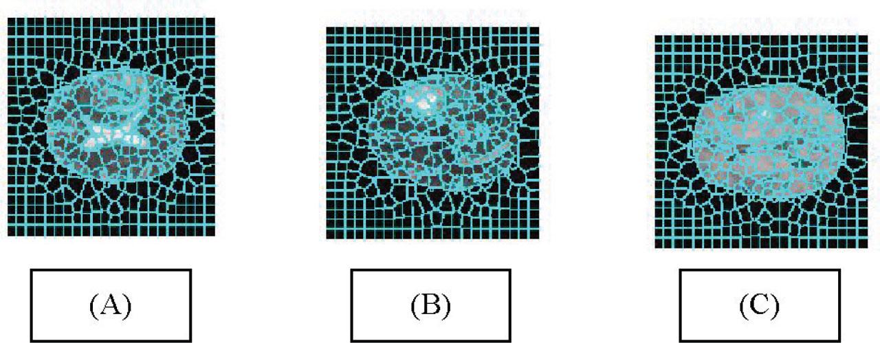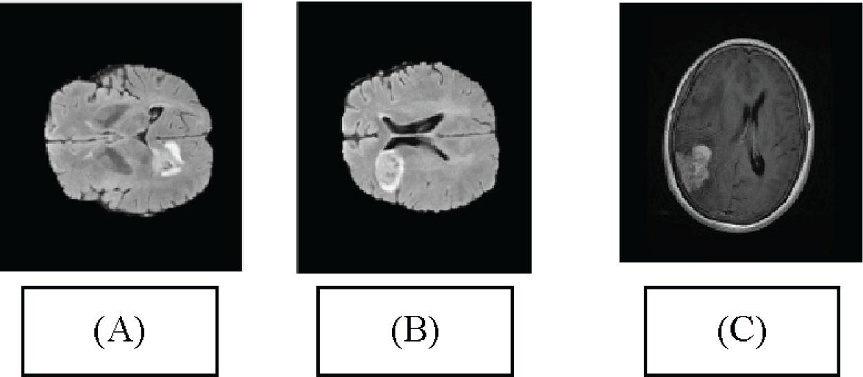 Illustration (A) Segmented image for the T1 MRI image (B) Segmented image for the T2 MRI image. (C) Segmented image for the FLAIR MRI image. MRI, magnetic resonance imaging.