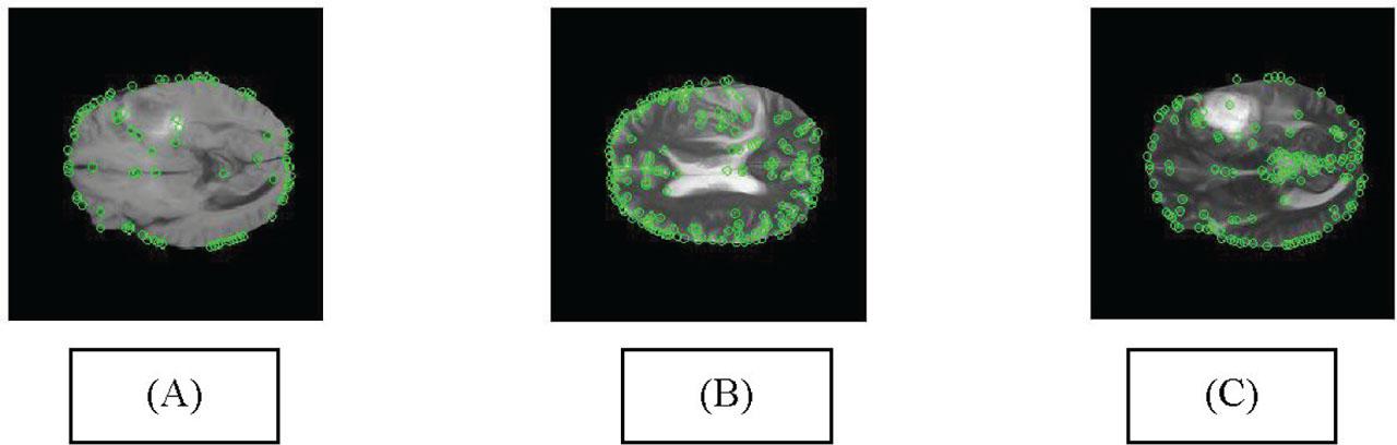 Illustration of (A) local features from T1 MR images and (B) local features from T2 MR images. (C) Local features from the FLAIR MR image.