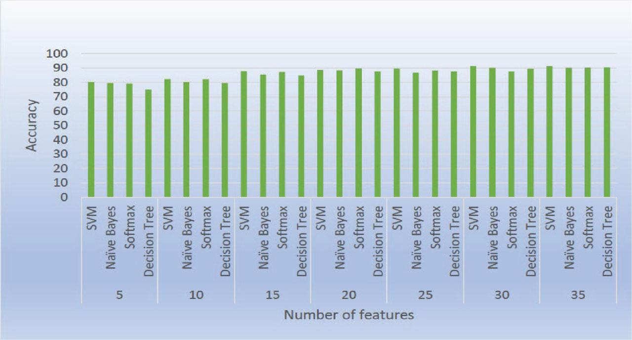 Accuracy chart of the proposed method with different classifiers for BraTS2018 with 35 fused features via PLS. PLS, partial least squares.