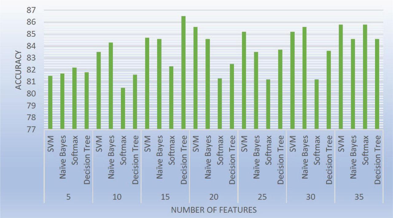Table 4 represents the comparison among different approaches with respect to accuracy, Recall and F1-score for BRATS18 dataset. It can be observed that the proposed approach works and integrated well with the existing classifiers like SVM, Naïve Bayes, Softmax, and Decision Tree (Figure 14).