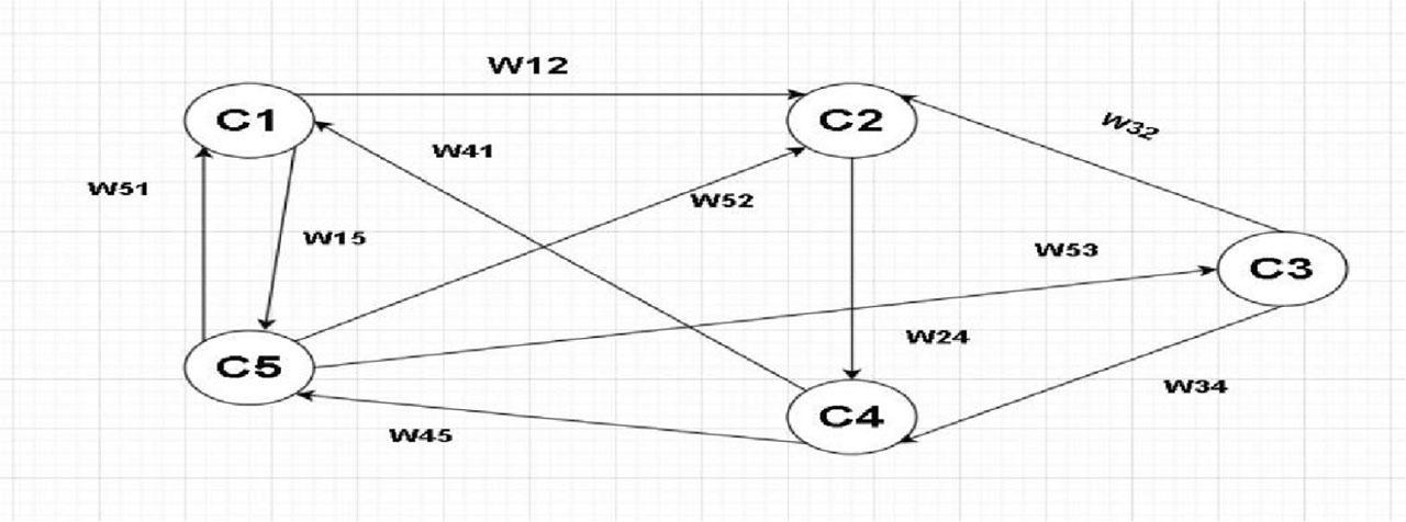 FCM is a directed fuzzy feedback graph consisting of nodes and weighted relationships. Graph nodes are concepts that are used to describe the basic behavioral characteristics of a system. The nodes are connected by weighted arcs representing the cause-and-effect relationships that exist between the concepts. Thus, it is possible to graphically represent the connections between concepts, their interrelation, and the degree of such influence. The graph makes it easy to add or remove concepts or relationships. Figure 2 shows the general view of the FCM. Nodes C1–C5 denote concepts representing the main objects or characteristics of the system; they can also be events, actions, goals, values, and trends of the system. For each concept, the number Ai is entered, which represents its value, is assigned by an expert, and lies in the range [0, 1]. The causal relationship between the concepts is depicted using oriented arcs (or edges) of the graph. For each arc, its weight Wij is entered to assess the degree of causality, and the weights of the links can vary in the range [−1, 1] [18, 19].