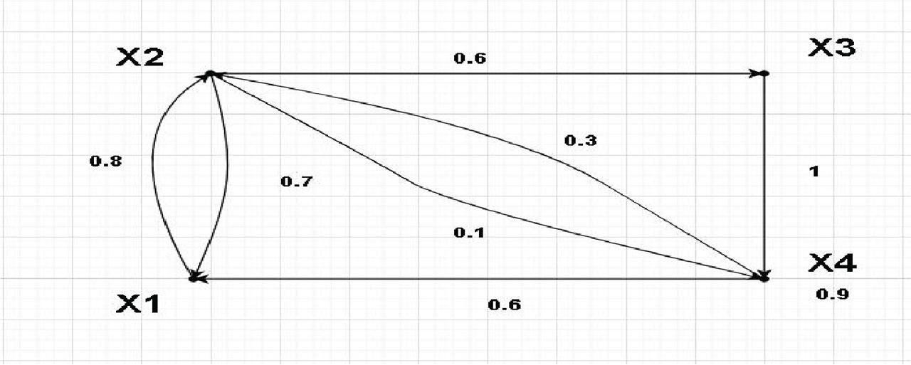 Ṹ = {<ϻu < xi, xk> / < xi, xk>>} is a fuzzy set of edges (or arcs), where < xi, xk> ϵ X2, a ϻu < xi, xk> is the degree of membership of the oriented edge < xi, xk> to the fuzzy set of oriented edges Ṹ [9].