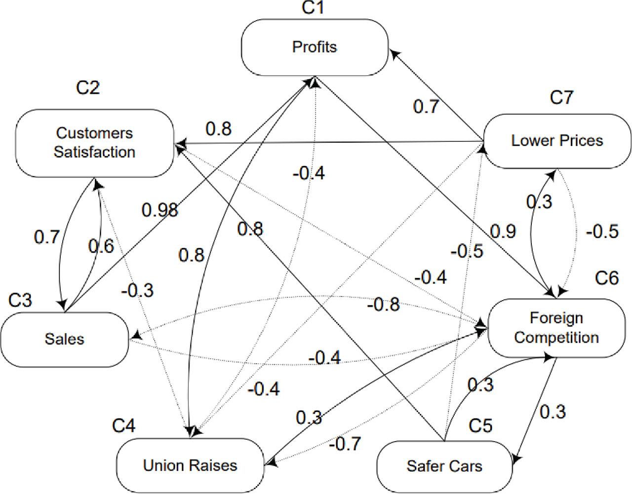 Using FCM, the automobile industry can be visualized. The neural concepts describing this system are high profits (C1), customer satisfaction (C2), high sales (C3), union raises (C4), safer cars (C5), foreign competition (C6), and lower prices (C7). In Figure 4, the network is visualized so that positive links are represented by solid lines, while negative links are represented by dashed lines.