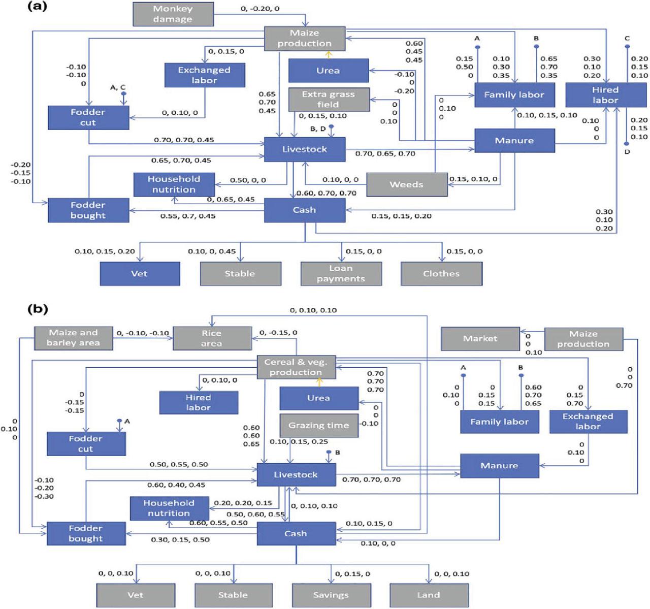 The FCM is designed to assess farmers’ perception of livestock intensification in central Nepal [15]. The novelty of this study is that the maps were compiled directly on the farm with the participation of farmers. This approach has proved useful for modeling various factors of farm development.
