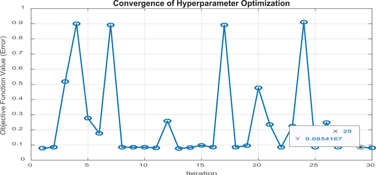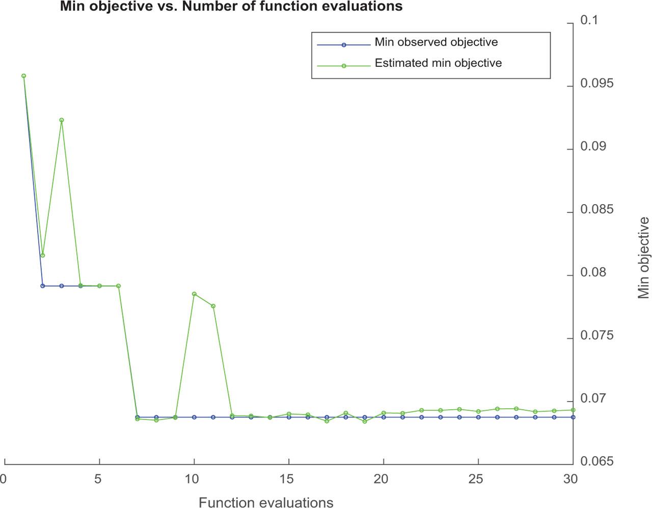 | Iter | Eval | Objective | Objective (run time) | Best so far | Best so far est time | Box constraint | Kernel scale |