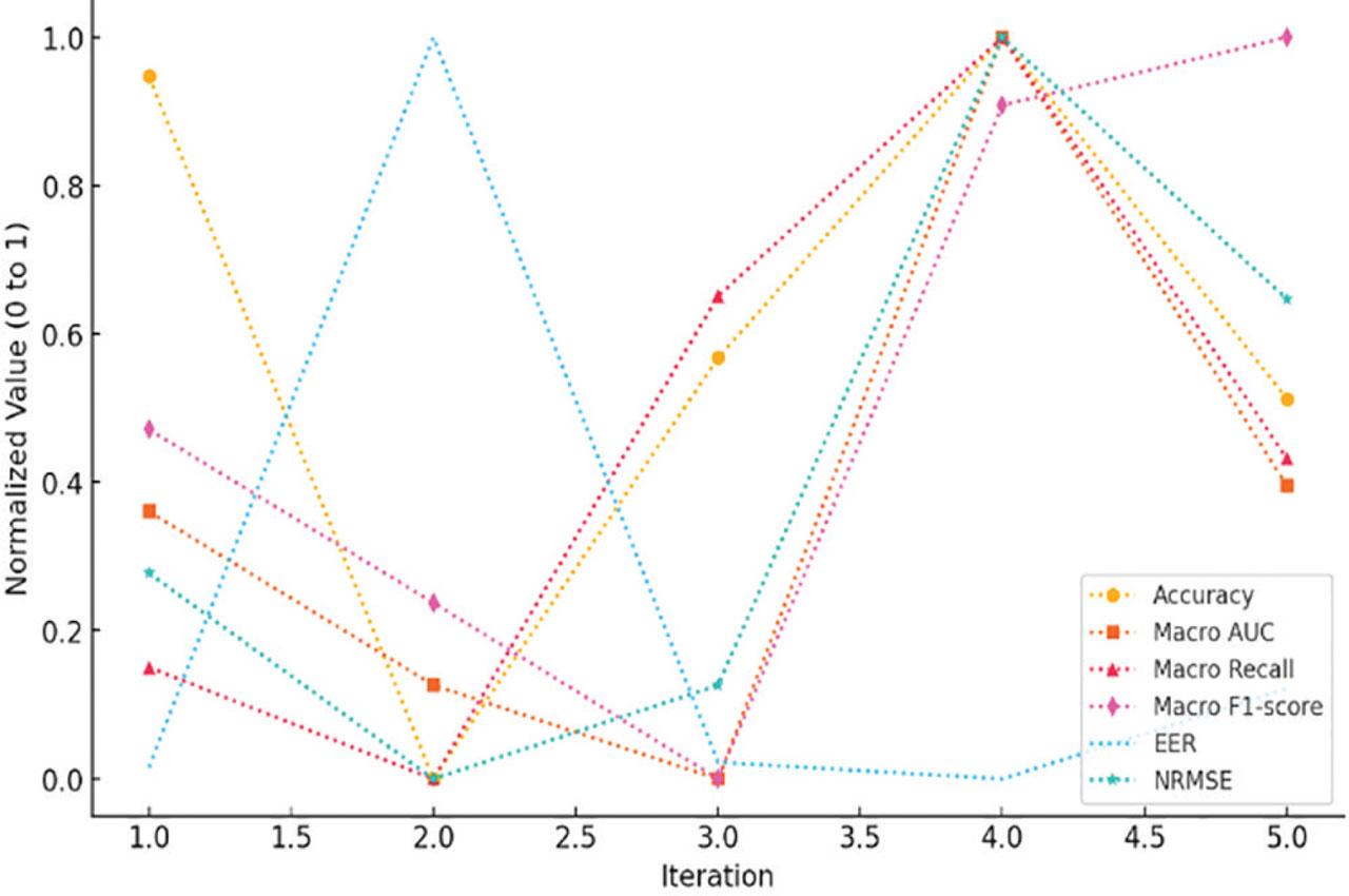 | Iteration | Accuracy | Macro AUC | Macro Recall | Macro F1-score | EER | NRMSE |
