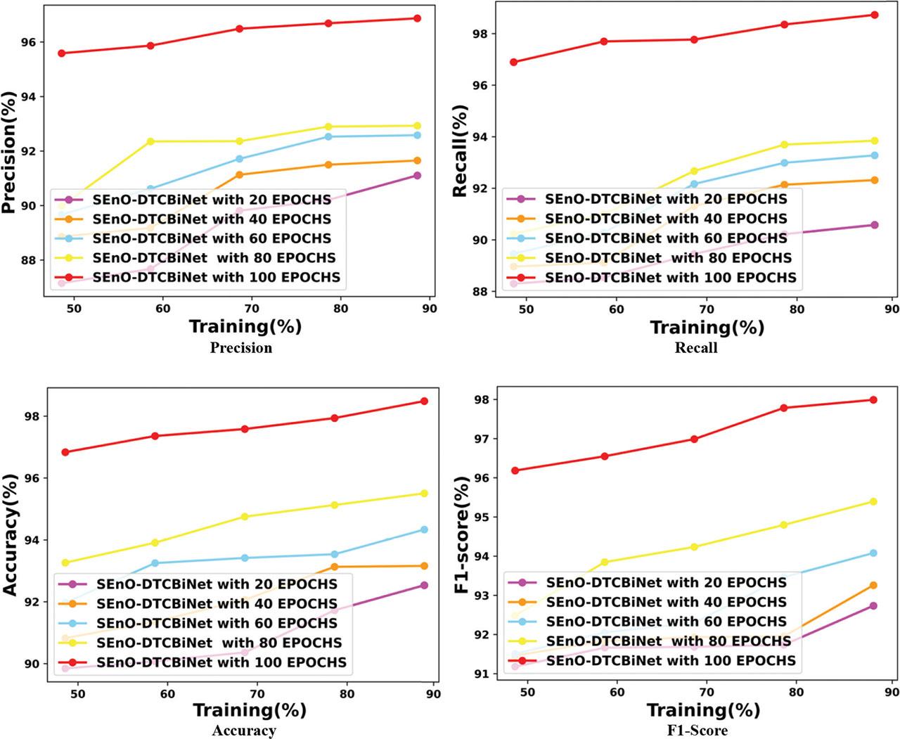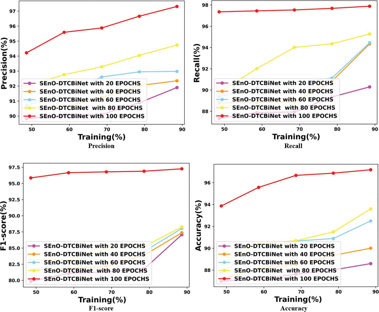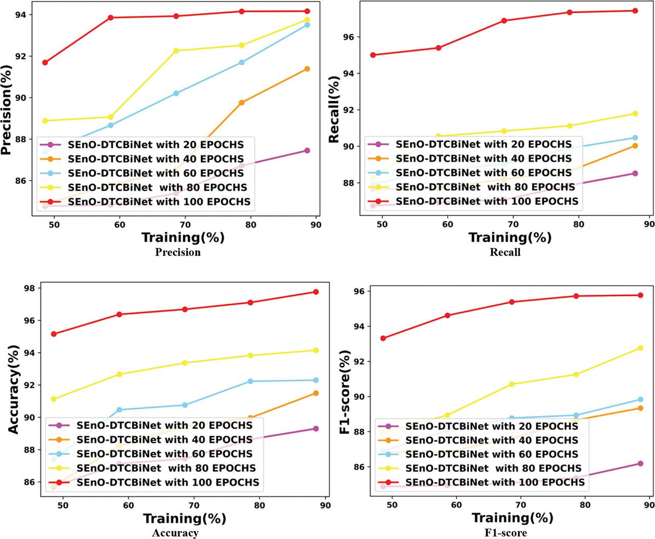 Results of the SEnO-DTCBiNet and baseline models based on training percentage