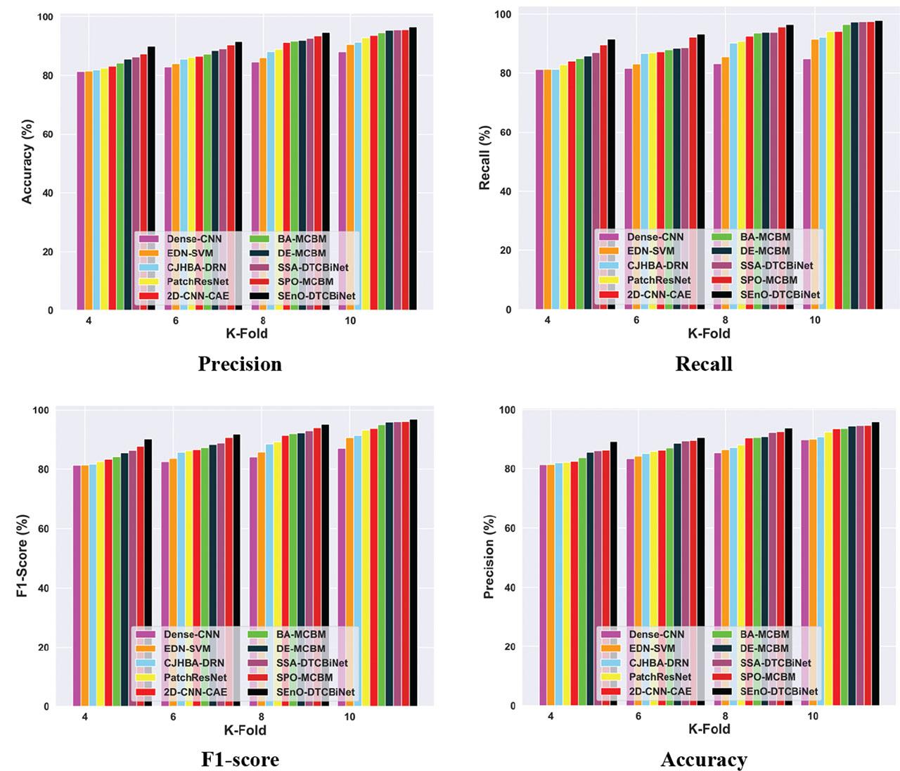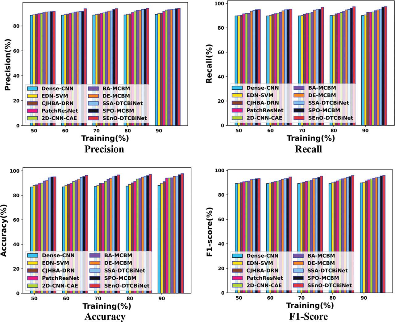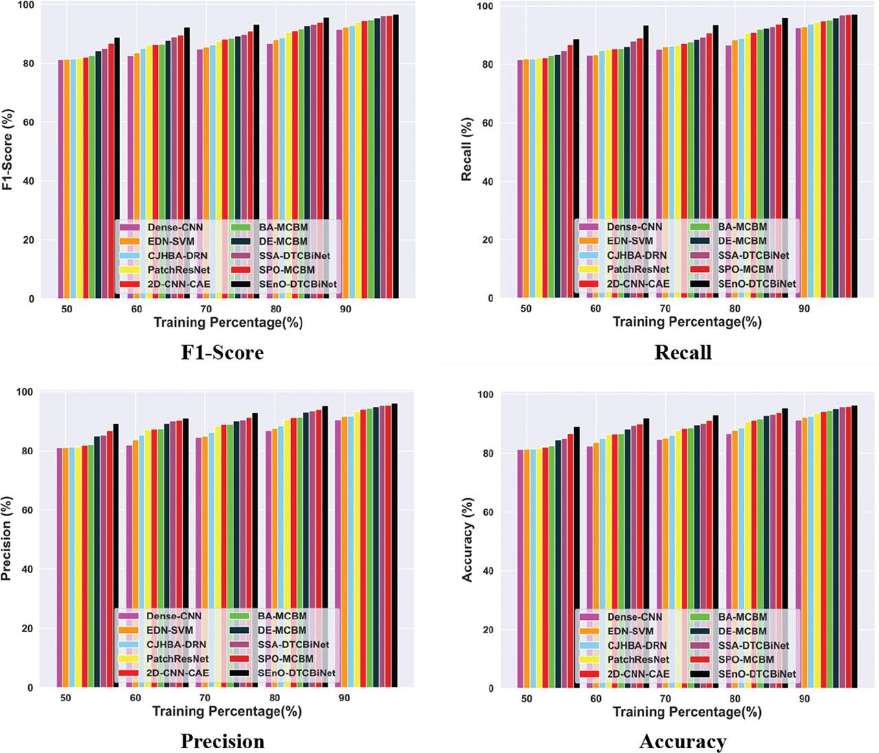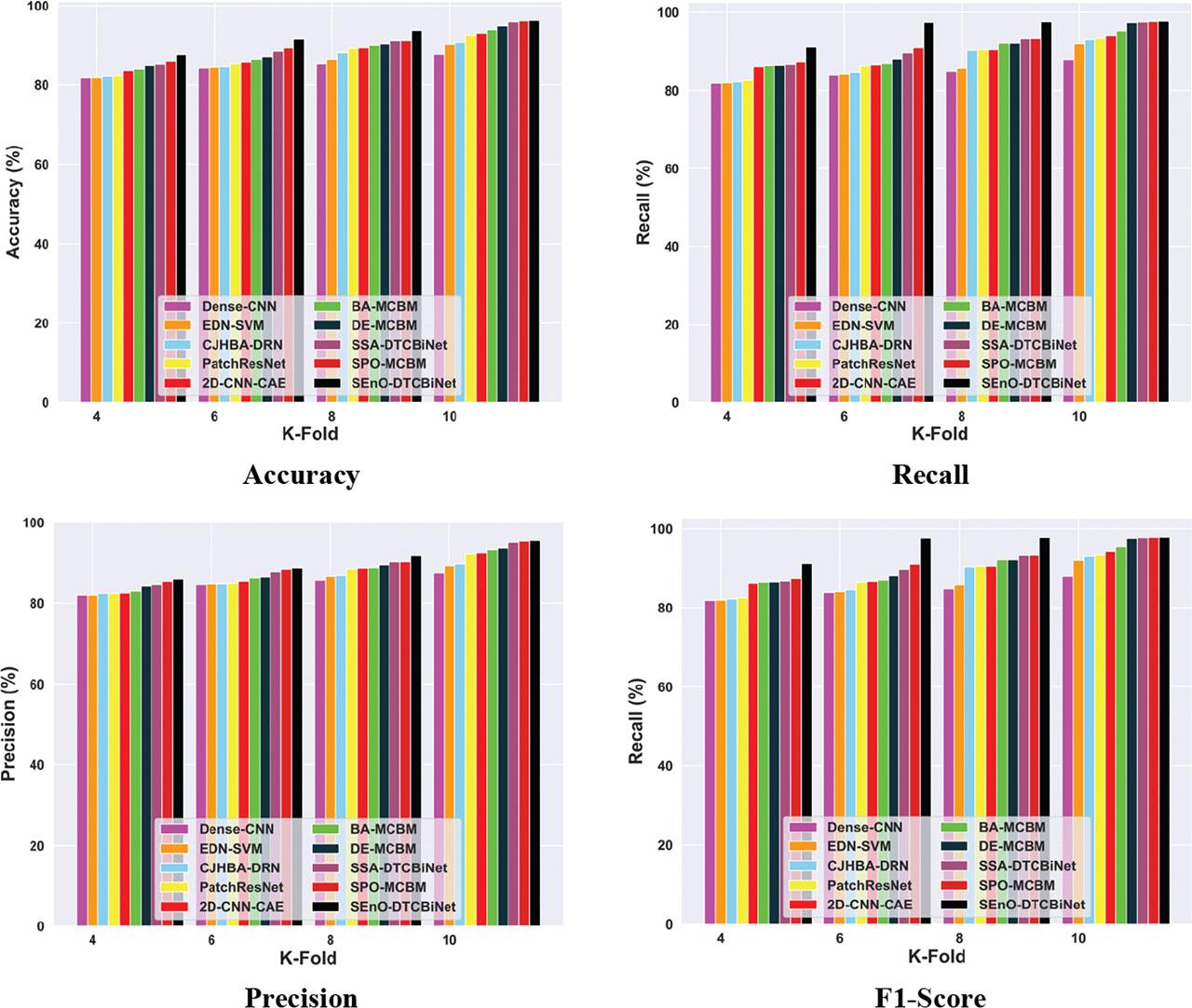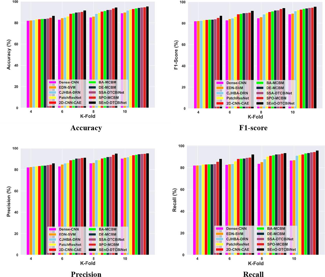 | Methods/metrics | 2D-CNN-CAE | DE-MCBM | Dense-CNN | CJHBA-DRN | Patch ResNet | EDN-SVM | BA-MCBM | SSA-DTCBiNet | SPO-MCBM | SEnO-DTCBiNet | |