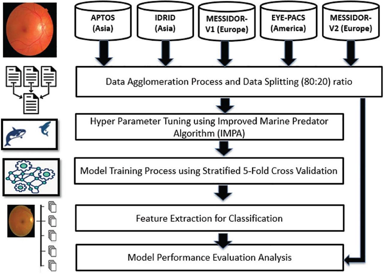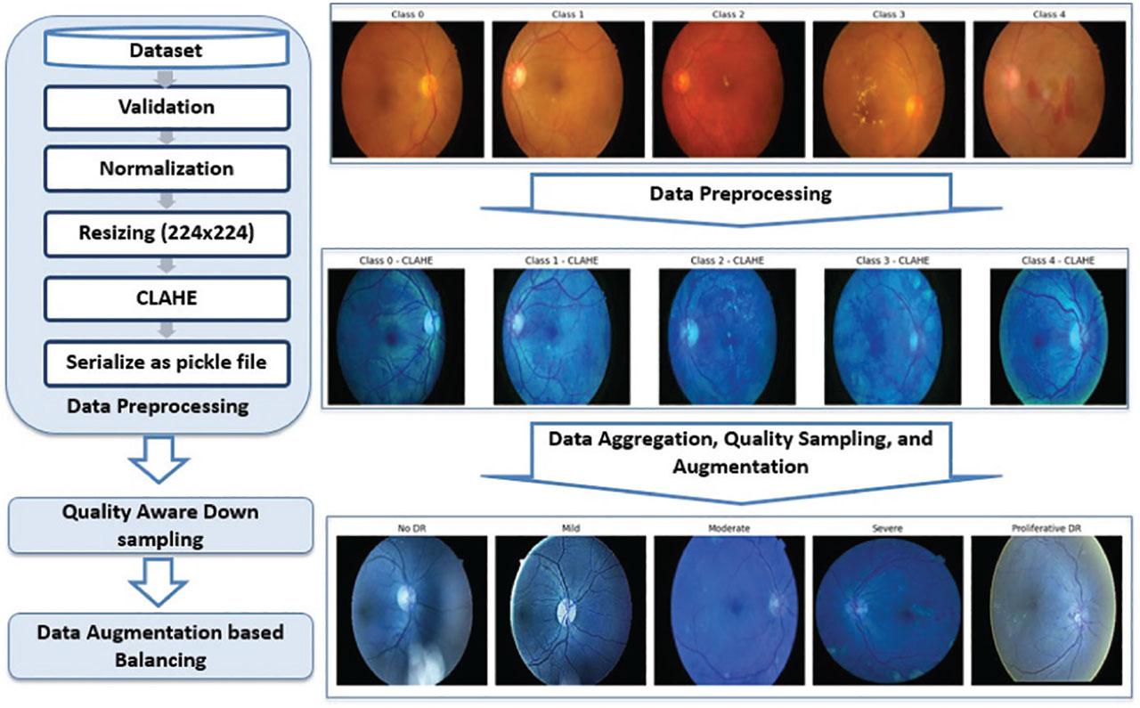 ARMDiaDR system combines multiple data sources captured using different devices or imaging conditions. To gain a more comprehensive view, a strong data agglomeration process is carried out on the individual datasets before the model training process to enhance both image quality and model training efficiency. The entire pipeline consists of three main phases: preprocessing, augmentation, and quality-aware down-sampling. This process serves as an important feature, as images from various datasets (APTOS, IDRID, MESSIDOR-V1, MESSIDOR-V2, and EYEPACS) are merged for experimentation. The pipeline automatically handles the preprocessing of multiple datasets as shown in Figure 2, eliminating the need for manual intervention and ensuring consistency across datasets. The images are loaded from their respective datasets, which are preprocessed and aggregated, and the majority classes are subject to quality-aware down-sampling and augmented to generate the training and testing datasets.