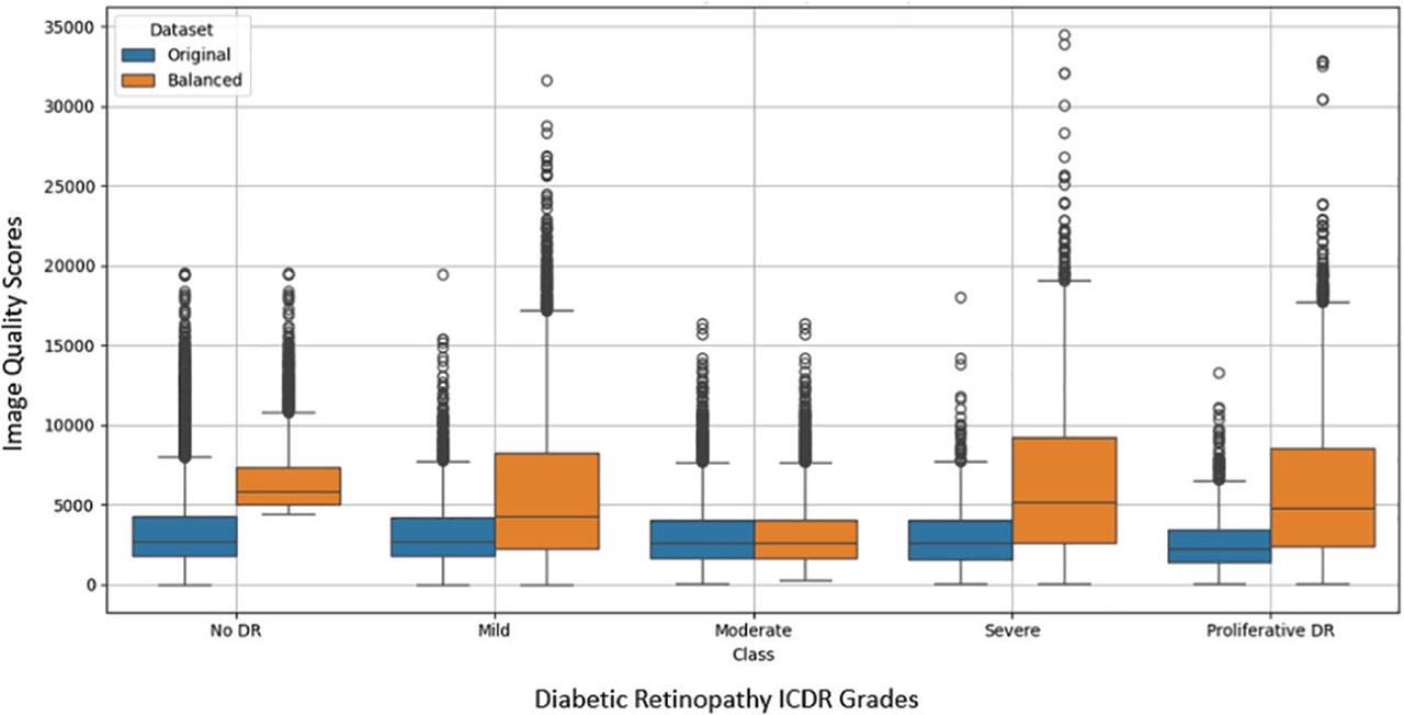 To ensure a balanced dataset suitable for training machine learning models, a quality-aware down-sampling strategy is employed on each dataset, as the fundus datasets are highly imbalanced. A threshold value of 7,000 images is set for the combined dataset for each class, consolidating to 35,000 images for all five classes. Each image is scored using a composite quality metric defined in Eq. (3), which combines sharpness, contrast, and brightness.