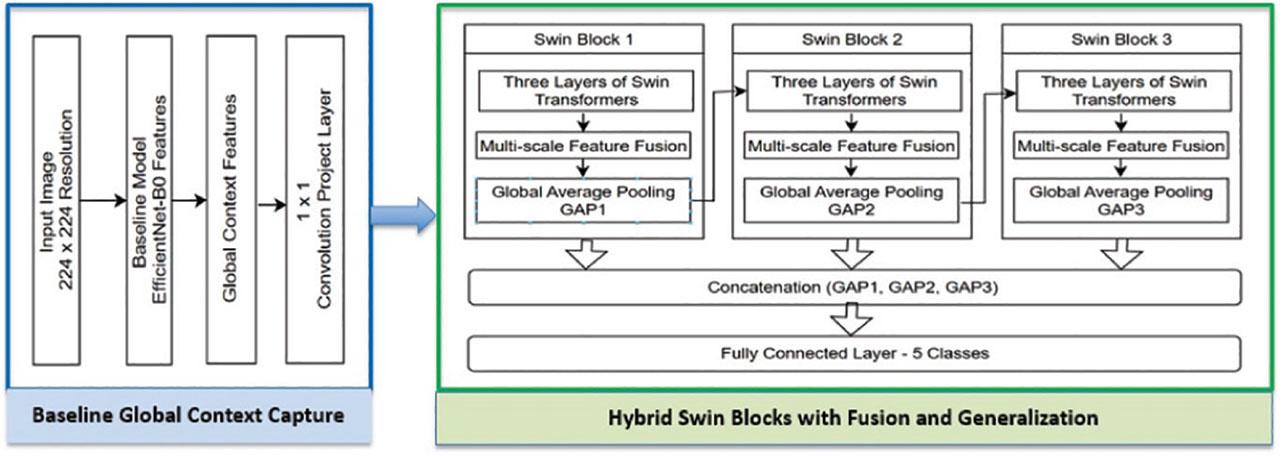 Introduction of the hybrid model, which first enriches the convolutional neural network (CNN) features with GC attention through EfficientNet-B0 and feeds them into Swin layers that deploy MSFF.