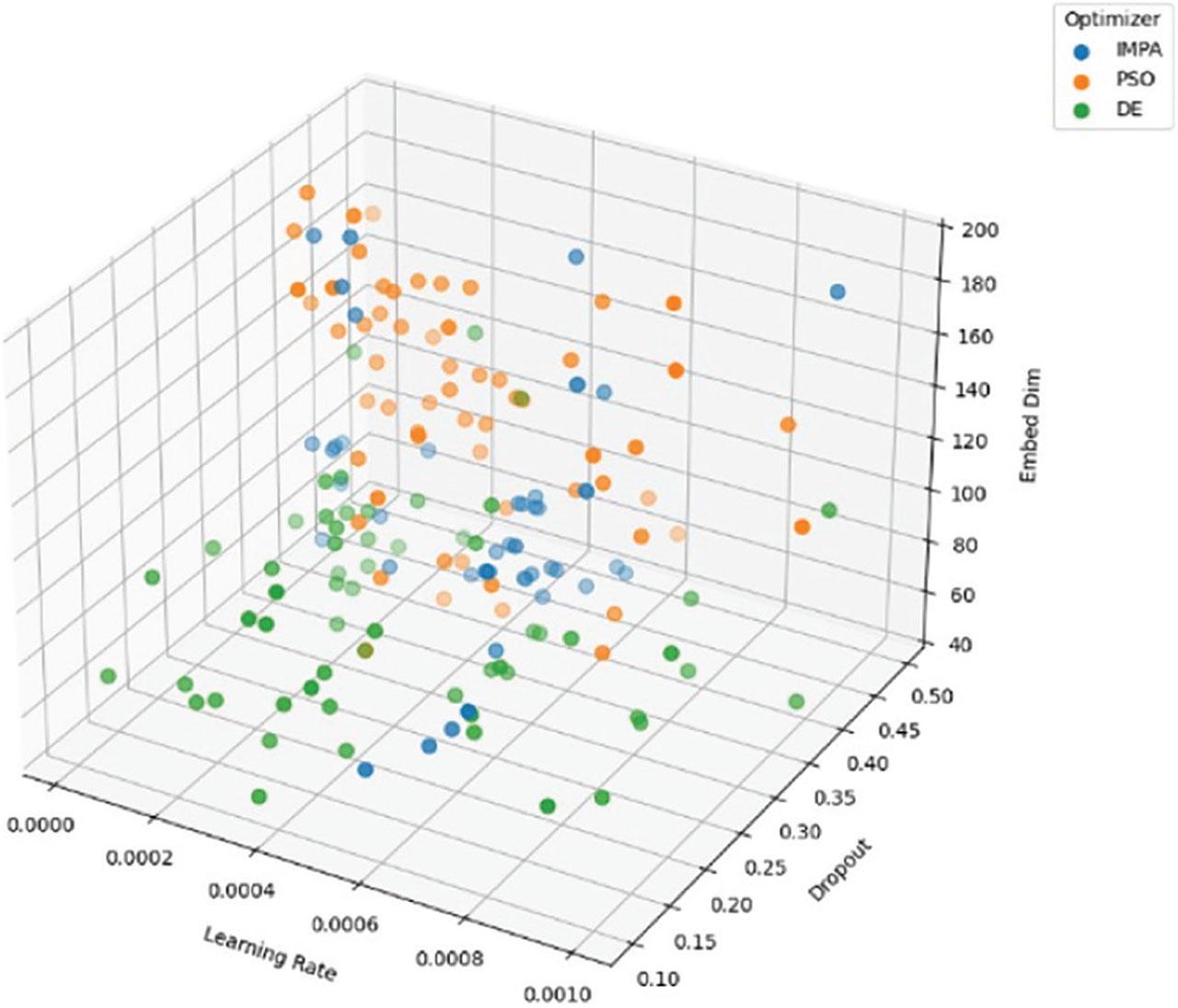 The hyperparameter tuning is performed for the experiment by a metaheuristic optimizer, the improved marine predator optimization (IMPO) algorithm, by training on the entire dataset for 10 epochs. Initially, the entire dataset is subjected to three nature-inspired optimizers, the improved marine predator optimization (IMPO) algorithm, the particle swarm optimizer (PSO), and the differential evolution (DE) to find the best optimizer for the given problem. The pair plot shown in Figure 5 visualizes the distribution of the three HP, learning rate lr, dropout dr, and embedding dimension embed dim explored during the exploration and exploitation process of the optimizers IMPO, PSO, and DE.
