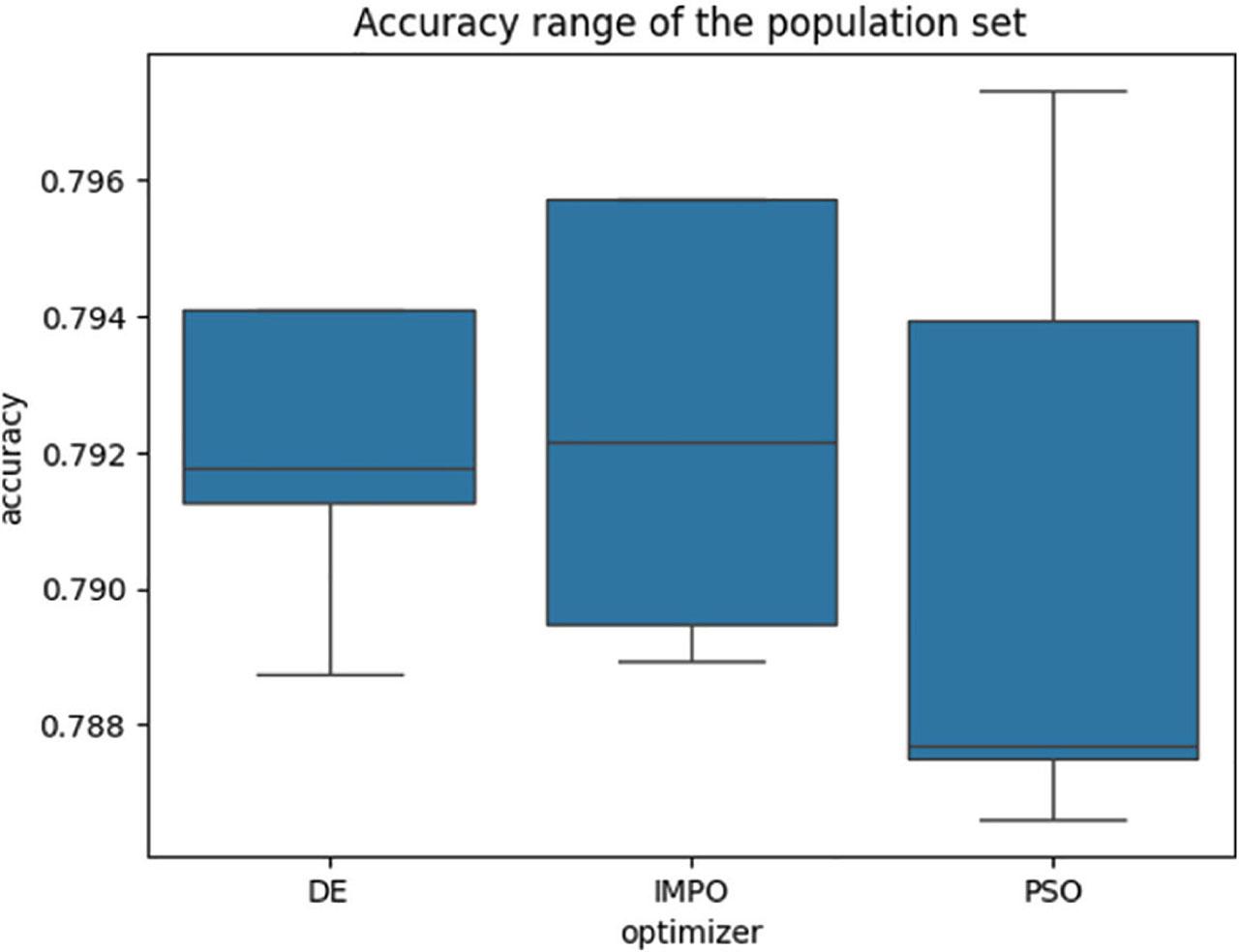 Accuracy box plot obtained from the three optimizer algorithms, DE, IMPO, and PSO. DE, differential evolution; PSO, particle swarm optimizer.