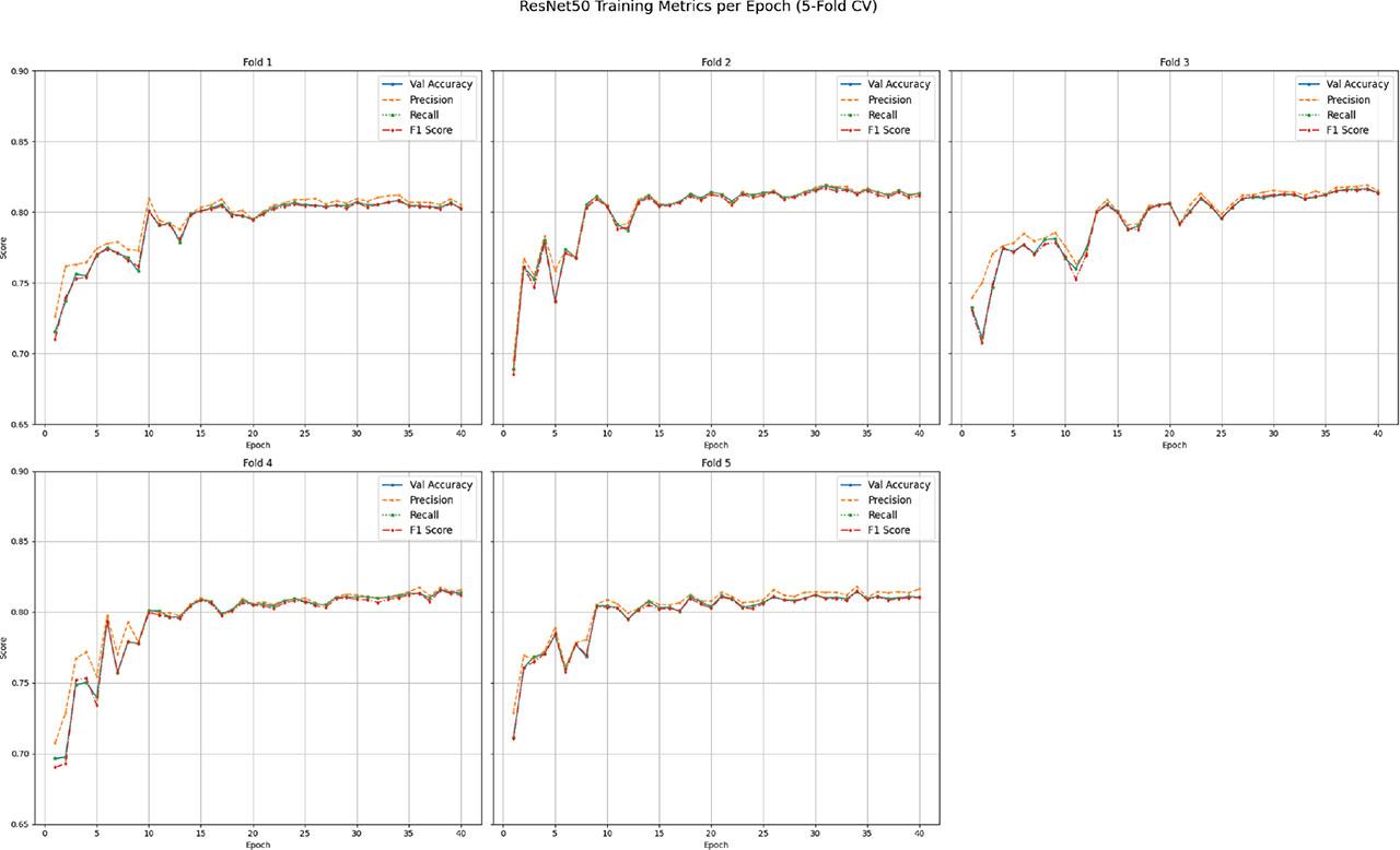 Results from stratified five-fold validation performed during the training phase using Resnet-50.
