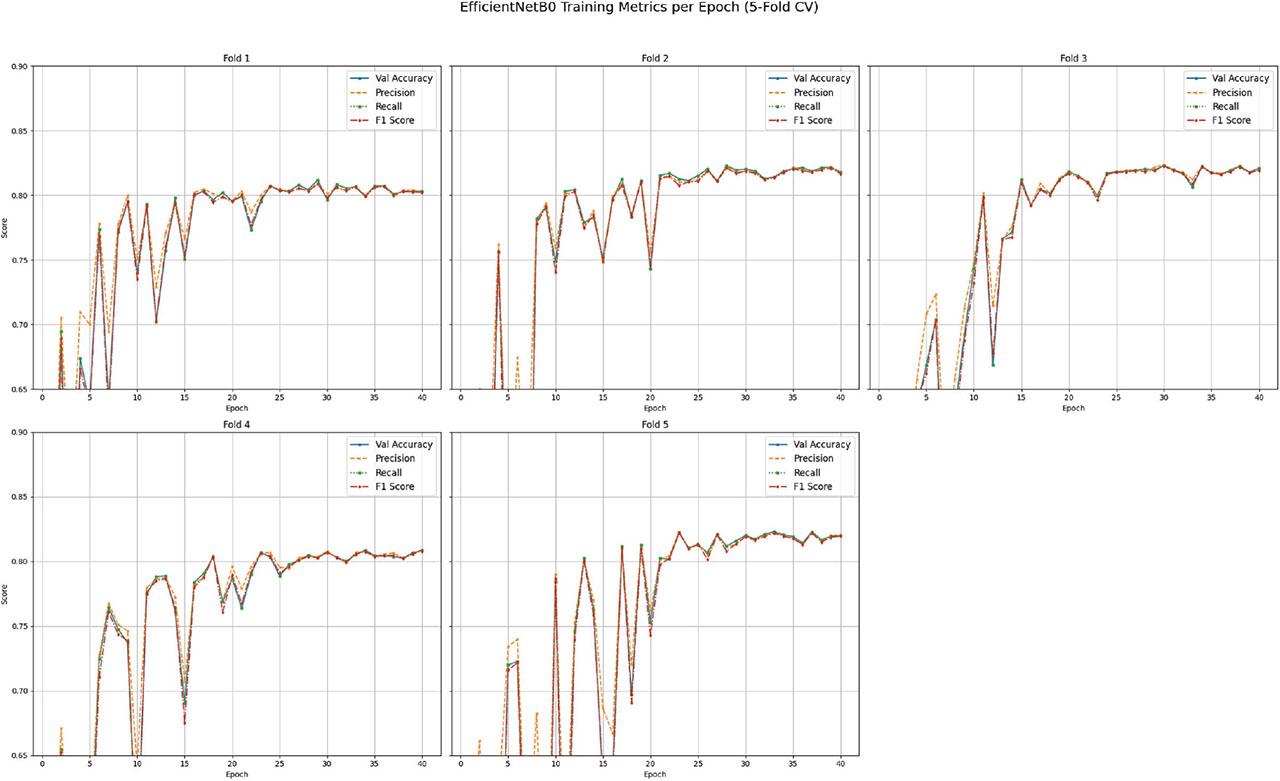 Results from stratified five-fold validation performed during the training phase using EfficientNet-B0.