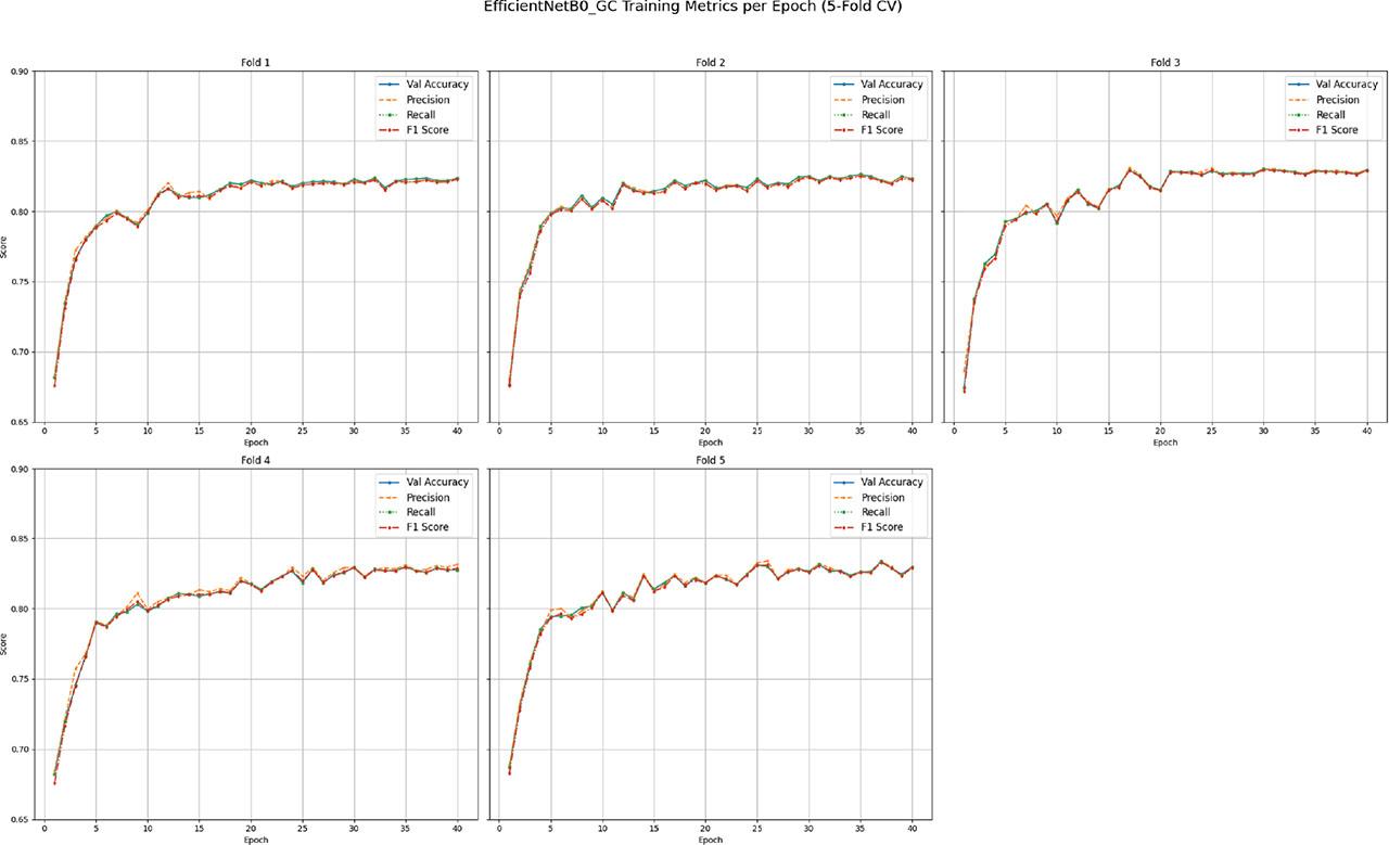 Results from stratified five-fold validation performed during the training phase using EfficientNet-B0 with GC. GC, global context.