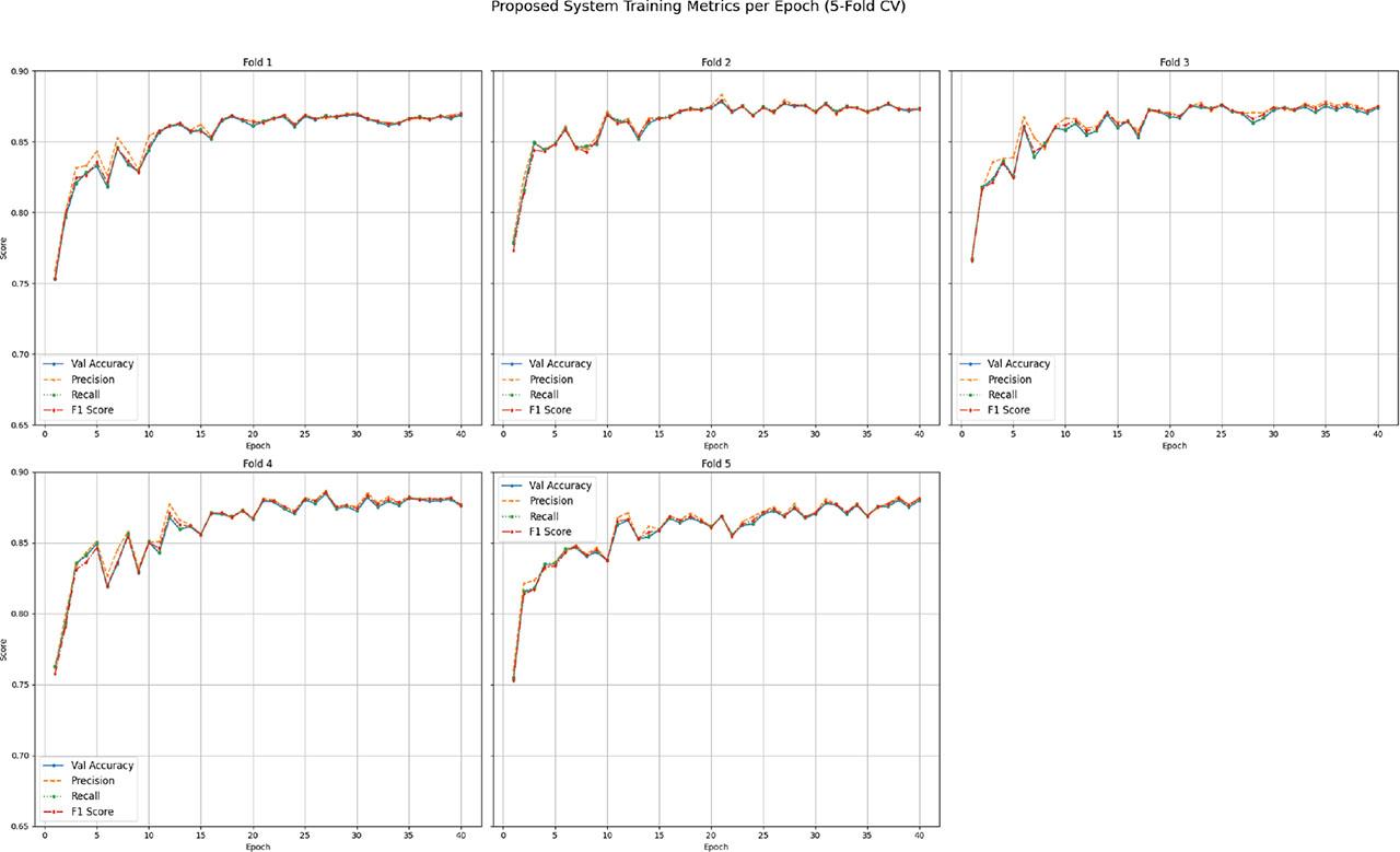 The comparison line chart shown in Figure 7 clearly shows that the proposed system has better performance compared to the various other models on the same dataset processed by the proposed system. The accuracy, precision, recall, and F1 score obtained during the training process in the five folds for the 40 epochs for the different cases are shown in Figures 8–12, with the proposed system in Figure 13. The proposed system has performed best in its training process with a weighted average accuracy of 87.42%, recall of 87.49%, and precision of 87.51% among all the cases mentioned.