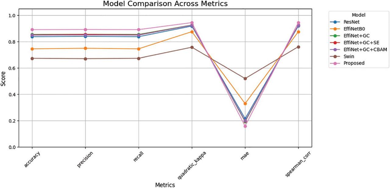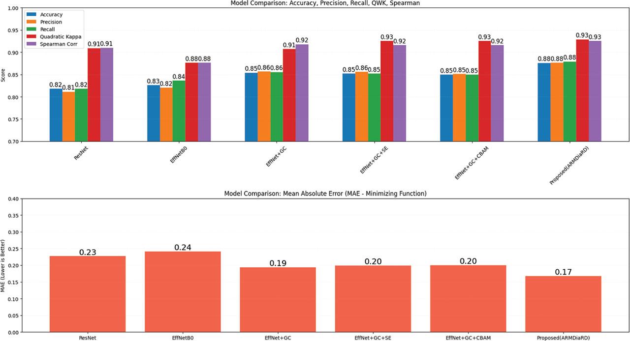 The testing model for the proposed system ARMDiaRD is developed using an ensemble evaluation of all five models generated through the five-fold cross-validation training phase. The model achieved an accuracy of approximately 87.59%, with a precision of about 87.6% and a recall of around 87.9%. The QWK and Spearman coefficients, which help in analyzing the variation from the actual score in case of wrong prediction, are high, with 0.9147 and 0.9253. This shows the proposed hybrid Swin layers capture context at multiple scales and complement the GC with a channel attention pipeline. The important metric in medical diagnosis of false predictions calculated by the mean absolute error (MAE) drops from 0.3310 to 0.1736, reflecting a reduction in prediction error magnitude in the proposed system by adding a hybrid Swin Transformer with hierarchical fusion of features. Importantly, the MAE, a critical metric for evaluating false predictions in medical diagnosis, dropped significantly from 0.3310 (baseline) to 0.1736 in the proposed model. However, the integration of a hybrid Swin Transformer on top of the baseline model, combined with training on a large dataset, has ultimately outperformed all other configurations. The graph shown in Figures 14 and 15 gives the ablation study results with clear advantages in both classification accuracy and ordinal consistency (QWK, Spearman), while also minimizing the MAE. Overall, the proposed hybrid ARMDiaRD system integrating GC and channel attention into a Swin Transformer achieves the highest performance across all key metrics: accuracy, precision, recall, QWK, and Spearman correlation, along with the lowest MAE. These findings confirm that combining local, global, and hierarchical features within a carefully designed hybrid architecture is highly effective for robust medical image analysis.