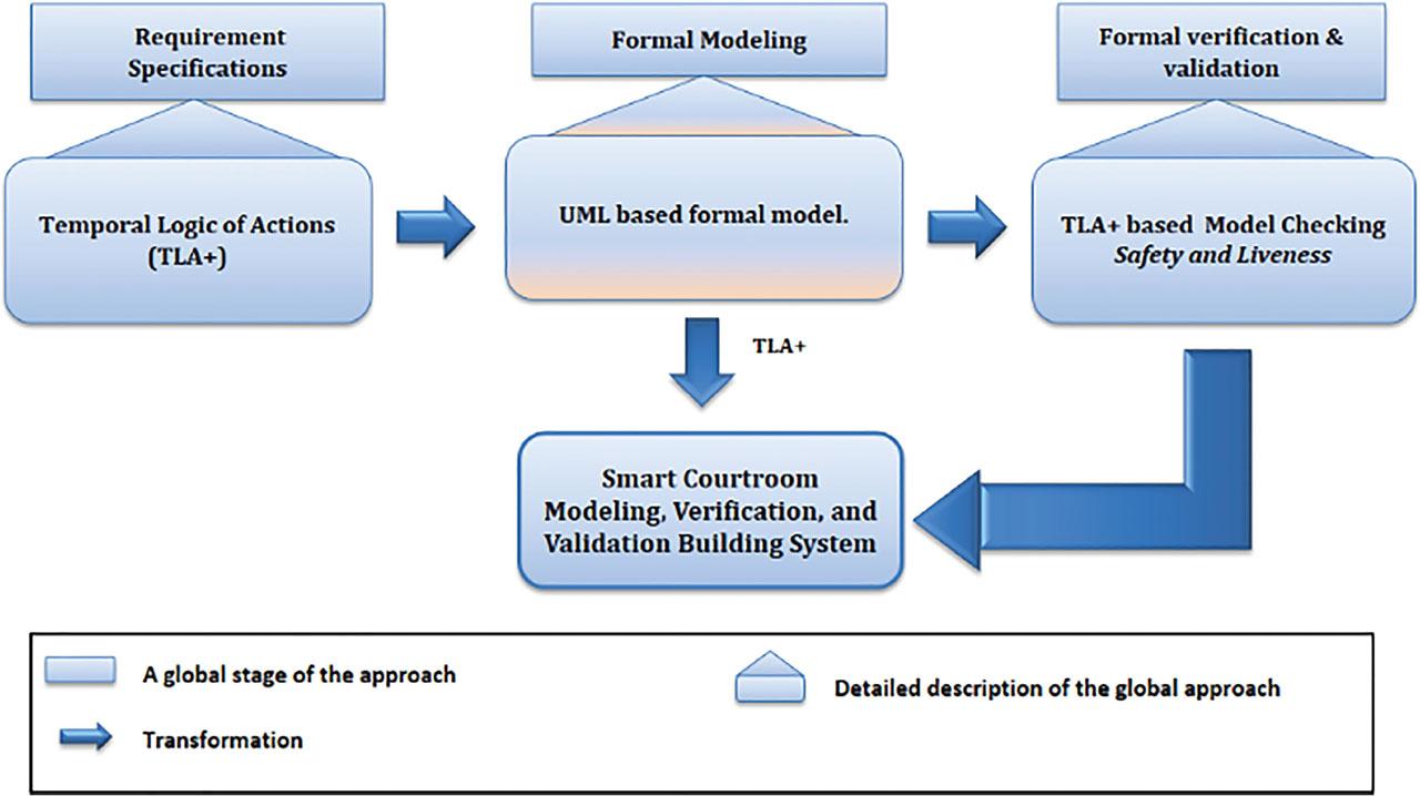 The research work has proposed a system that varies slightly due to the distinctive environmental and the distinctive features compared to the elementary courtroom. The primary objective of this smart system is to integrate interconnected subsystems to create a comprehensive, smart, and autonomously controlled system. Safety stands out as a critical property that these systems must possess, particularly in the context of our SMCBS. Another essential characteristic to be incorporated into these smart systems is security. While many researchers tend to focus on achieving either safety or security, our proposed model aims to establish a system that is both secure and safe. Future discussions will explore further into the details of the proposed system. Various smart systems have undergone verification and validation through formal methods, utilizing different formal specification languages [49,50,51], such as Alloy, VDM, Z, and TLAplus. Latif et al. [52] applied TLA+ for modeling and verification n of a smart parking system, while Rehman et al. [34] used the Vienna Development Method Specification Language (VDM-SL) toolbox for designing and verifying the smart office system [53].