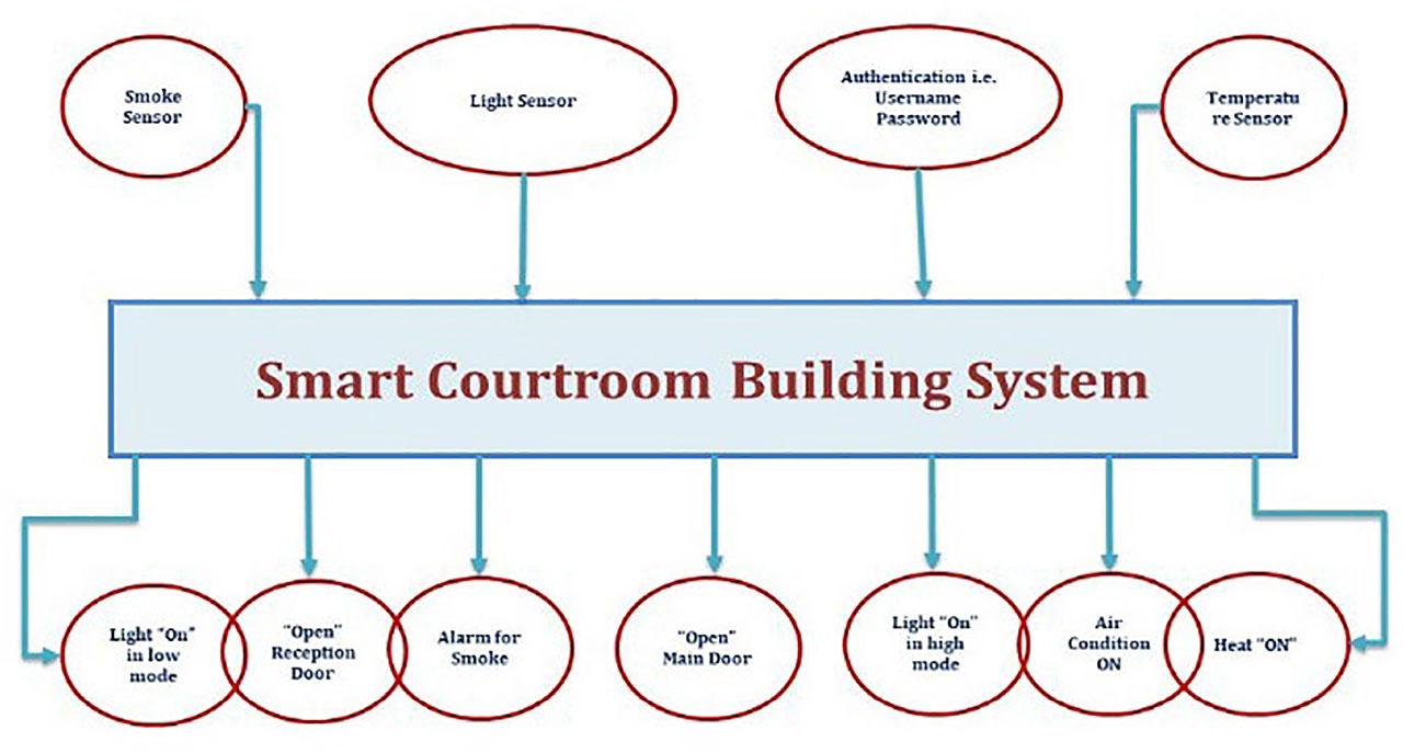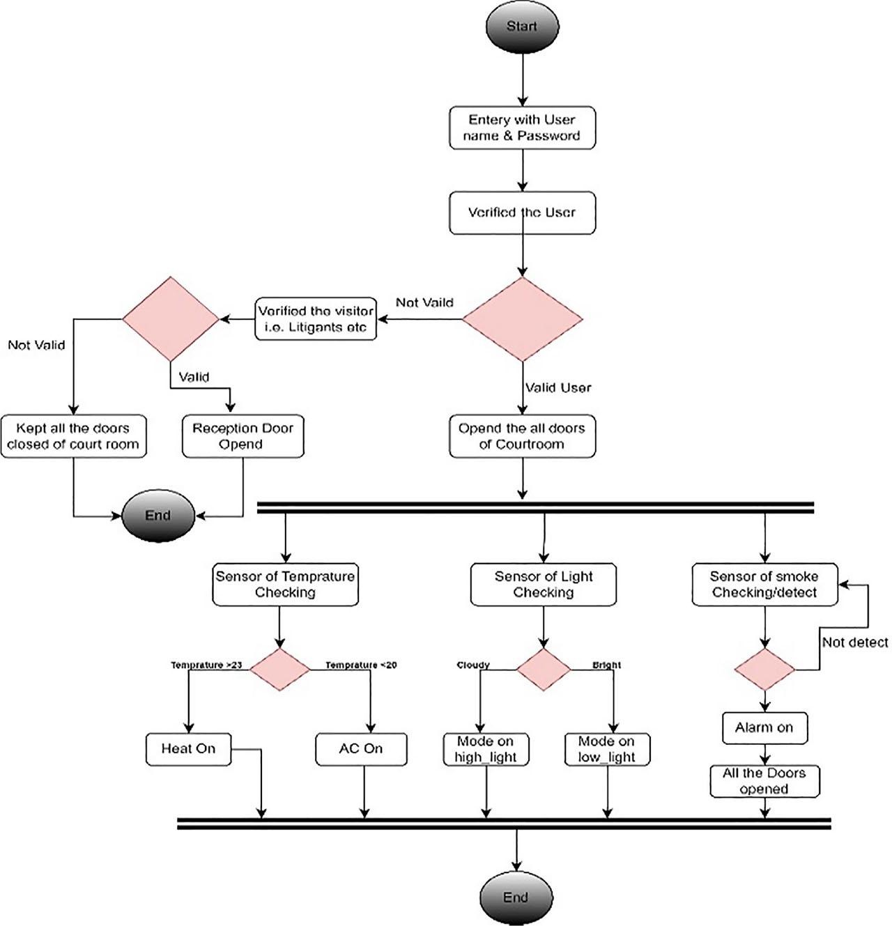 The UML stands out as the foremost language to show the abstract model of any system. Offering graphical notations, it adeptly captures the properties of a system [57, 58]. The system received the inputs and feedback from three different types of sensors: smoke, light, and temperature sensors. Additionally, users, including presiding officers, court staff, advocates, and litigants, directly provide input through their logins, applying their unique usernames and passwords. The system’s outputs convey actions such as correct or incorrect logins, temperature status within the building, smoke detection alerts, and light brightness levels. Figure 2 demonstrates an activity diagram for the proposed smart courtroom building, showcasing all sequential actions executed by the system and enhancing overall comprehension. Initially, accused, employees, and visitors enter the court building, every retaining a separate username and password. Upon entering the correct username and password, the accused and employees gain access through the main door, which automatically opens for them. Visitors missing login credentials must pursue approval from the reception employee; if approved, only the reception door grants them entry, while all doors remain closed if not accepted. After the building is vacant, numerous systems are automatically deactivated. However, upon the arrival of a student or employee, all subsystems initiate automatically. A temperature sensor monitors the building’s temperature, triggering the heating system if it falls below a specified threshold (20°C) and activating the AC system if it exceeds another threshold (23°C), as we assumed the temperature as per the given atmosphere of the country. Additionally, the lighting subsystem adjusts according to ambient sunlight to minimize power consumption. For instance, on sunny days, the system switches to low-light mode since bright lights are unnecessary. Meanwhile, the burn discovery system operates continuously to ensure the safety of the building. If smoke or fire is detected, alarms sound, and in the event of a fire, all doors automatically open, facilitating a swift and secure evacuation for everyone within the building.