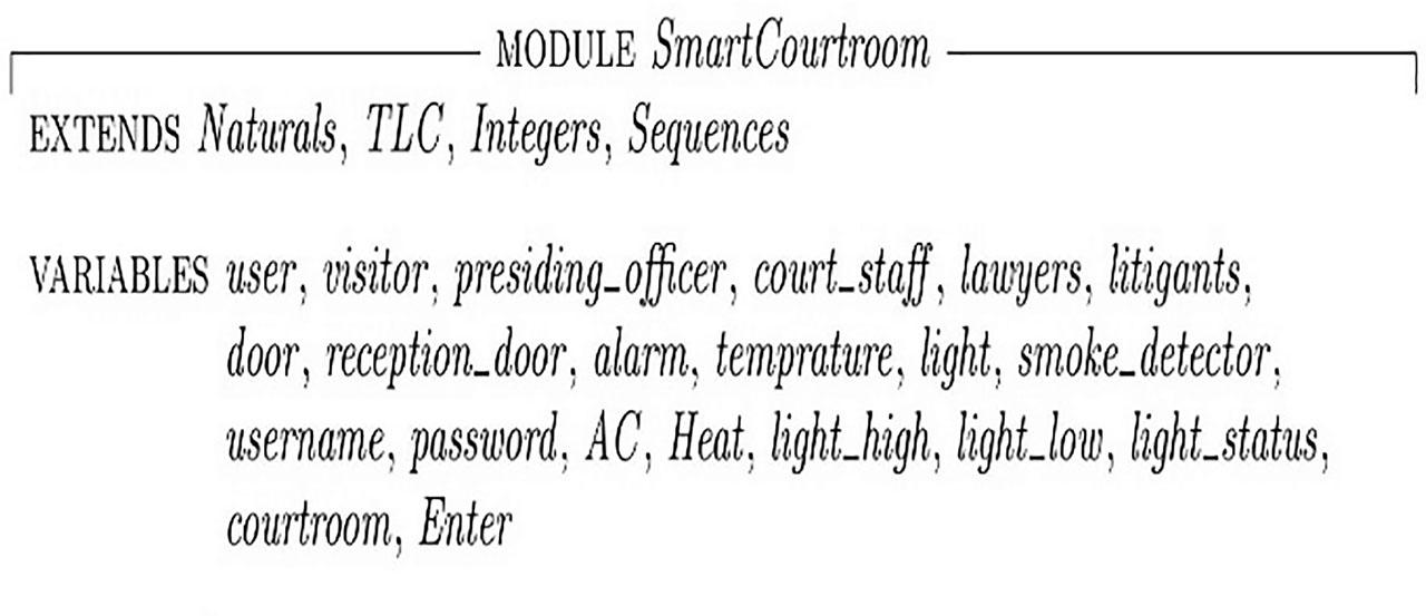 The top figure of the module of Smart Courtroom structures the variables defined in Figure 4. After the name of the module, following keyword EXTENDS is used to refer to libraries, such as Naturals, TLC, Integers, and Sequences. User variable serves to identify individuals authorized to enter into the courtroom building, including presiding officer/judge, court employees/staff, advocates, and litigants.