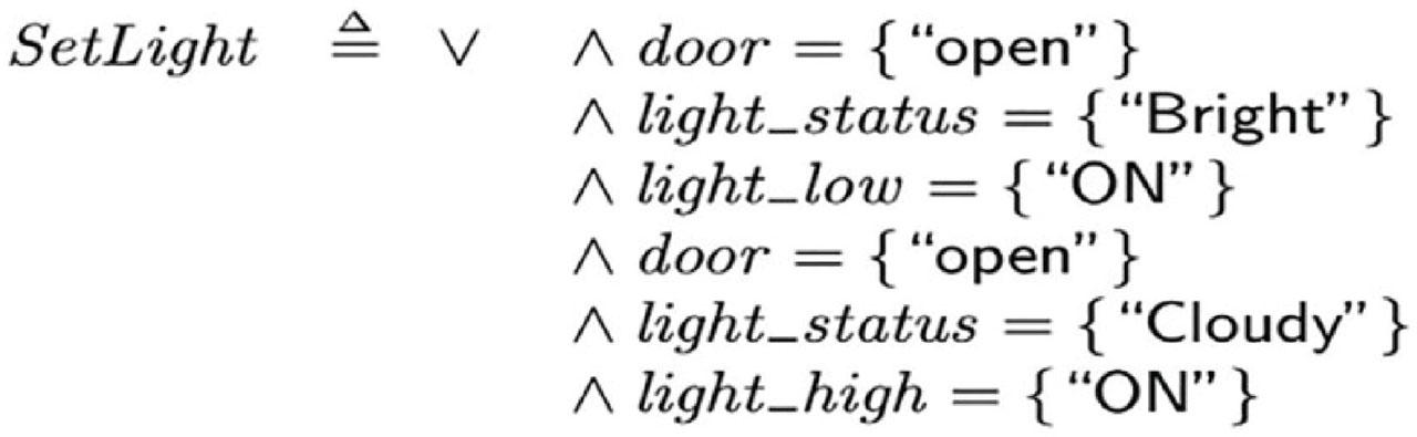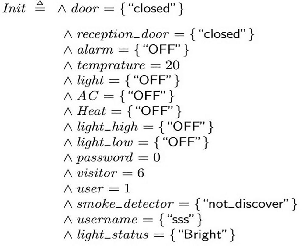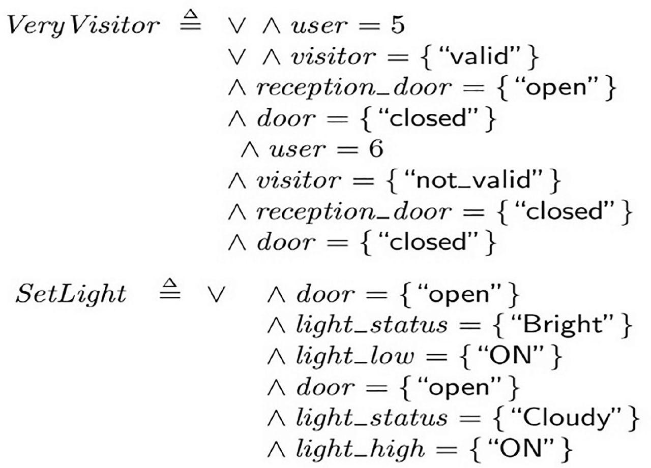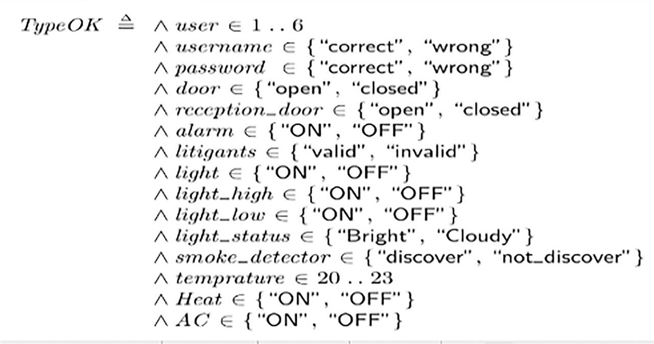 The visitor and user variables represent an individual missing a username or password, requiring approval from an employee to access the building. The door_variable indicates the core entry door for the presiding officers and court staff, while the reception_door describes the entrance for advocates and litigants. The alarm_variable links to the smoke detector, activating an alarm upon smoke detection. Username and password variables store the unique login credentials for each presiding officer and court employee. The thermostat variable captures the sensed temperature, and the AC and Heat variables represent the heating and air conditioning systems. The lighting system comprises four variables first light indicates the on or off status, the second light_status receives input from a sensor determining sunlight conditions, producing output for either light_high mode (bright lights on cloudy days) or light_low mode (dim lights on sunny days for energy efficiency). So, system invariants are well-defined below, including conditions of user having four possible values (1: presiding officer, 2: court employee, 3: advocates, and 4: litigants), presiding officers requiring username and password verification to enter the judicial complex building, litigants and advocates needing permission for entry, and temperature remaining stable within the range of 20°C–23°C as we assumed earlier in our case. We categorized users into four types (presiding officer, court employee, advocates, litigants) based on typical courtroom hierarchies. This simplifies access control but may not capture the full complexity of real-world court operations.