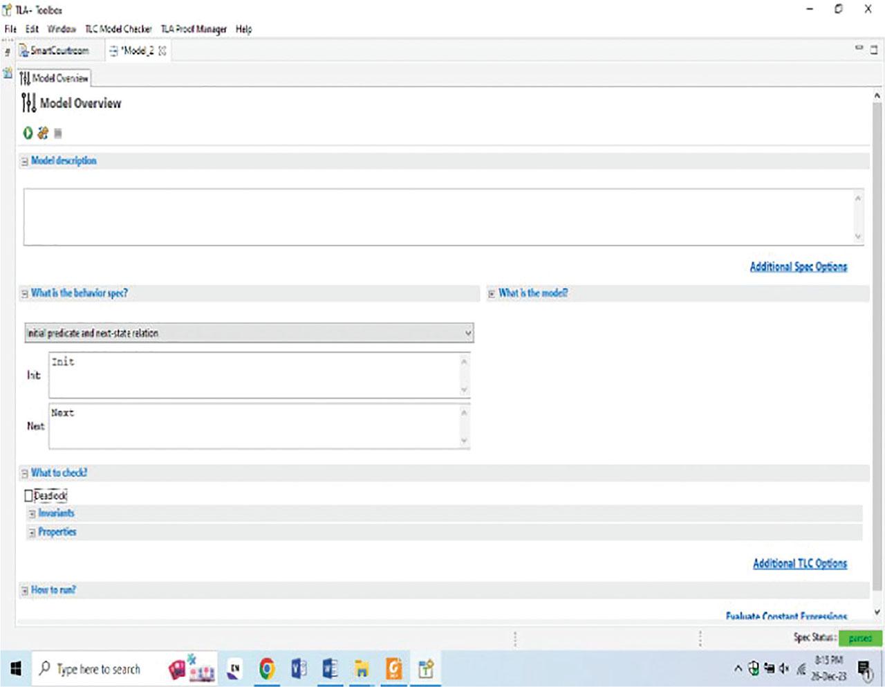 Once the specification has been successfully parsed, the smart courtroom building module can be executed after using the TLC model checker, as the same is built-in TLA+ tool. For a successful run of the TLC model checker, two parameters must be configured for the model overview after its creation. So, the first contains selecting the initial-predicate in the toolbox of TLA+ and determining the behavior of the next-state relation, while the second entails unchecking the deadlock option. Once all parameters are set in accordance with the specifications shown in Figure 13, the model checker can be executed. If the specification is free of errors, then the TLC model checker will adeptly parse all states as defined in the specification using the TLA+ toolbox. Otherwise, it will fail to show any distinguished states in both cases of the Init and next state. So, this process is completed by the distinguished states to couple with successful exploration of the state space, serving as evidence of the system’s correctness.