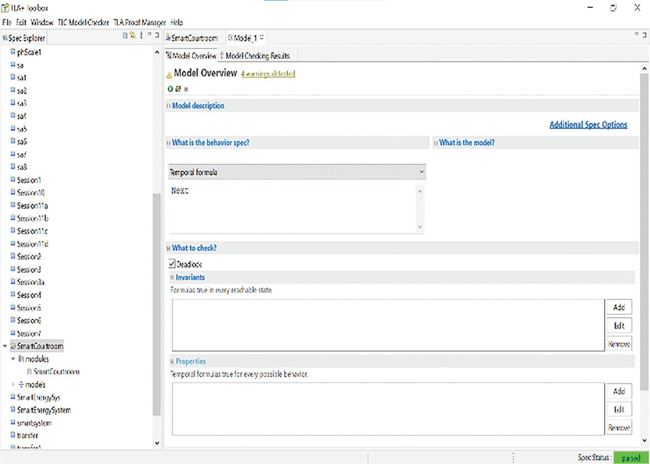 UML during verification and validation: We have used the UML for the purpose of modeling our conditions, and we have written our specifications as per the requirements of the court building. Afterwards, we verified the invariant and temporal properties for the validation of our results. The UML diagram used here is only for the modeling of our conditions to some extent. We have specified the property specification to define the correctness of properties in TLA+ based on the expected behavior represented in UML diagrams. We have also checked the model specifications to run the TLC model checker on the TLA+ specification. We have also checked the Error detection. If TLC detects violations of specified properties or inconsistencies in the model. As previously mentioned, several tools are available for system specification, including VDM-SL, Z, RAISE [72], and TLA+ [49,50,51, 73]. For the verification of our system, we chose to utilize TLA+. TLA+ stands out for its enhanced capabilities, particularly its model-checking technique, which ensures the verification of a system. Using the TLA+ toolbox, we enhanced the correctness of our proposed system. The parsed model, as depicted in Figure 12, confirms the accurate interpretation of the proposed model using the TLA+ toolbox and shows a green box at the bottom left corner of the given, and has undergone correct parsing through the TLA+ toolbox, setting the stage for verification through the TLC model checker. The mathematical analysis of this proposed model shows the expansion of TLA+ techniques, and the correctness of specifications and checks has been validated. Additionally, TLC has verified the proper use of object variables in the model.