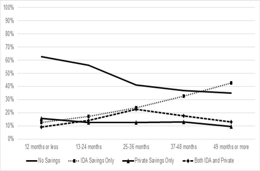Multinomial regression analysis and predicted probabilities show that access to IDAs has a positive and significant association with one’s chances of saving in an IDA only. As length of SSP participation increases, the percentage of participants without savings decreased dramatically from 63% in the first year to 35% in the fifth year. At the same time, the proportion of study participants who saved only in IDAs increased considerably (13% to 43%) for the five years in SSP. These results imply that low-income individuals can save and accumulate assets if appropriate supports and incentives are provided.