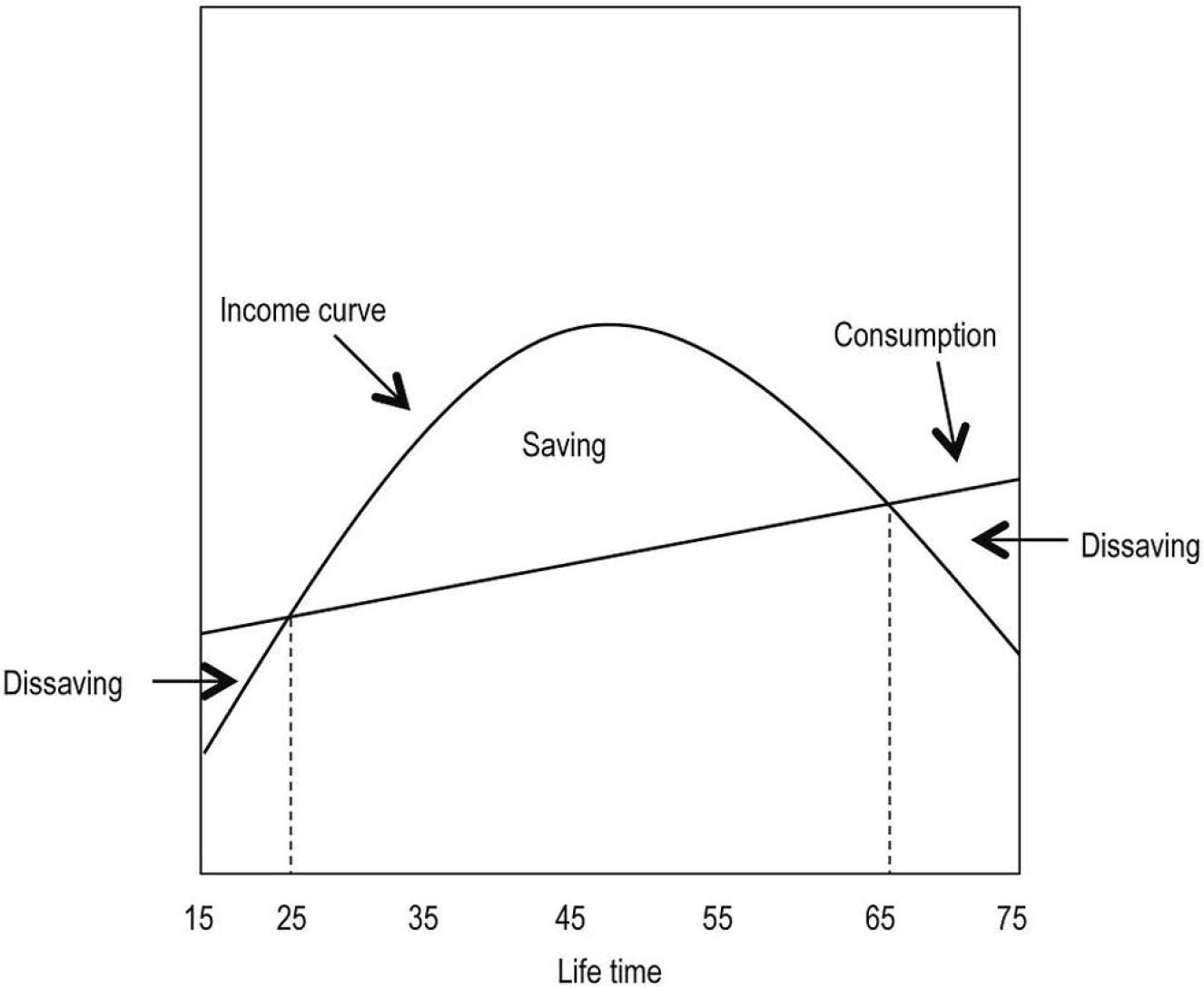 The Life Cycle Hypothesis, proposed by Modigliani and Brumberg in 1954, is an economic theory that elucidates how individuals make decisions regarding consumption and saving throughout the course of their lifetimes (Modigliani và Brumberg, 1954). The theory posits that individuals strategically determine their patterns of spending and saving by taking into account their anticipated lifetime earnings. According to this notion, individuals strive to maintain a consistent level of living standards during their lifetimes. This entails saving during their working years and subsequently utilising those savings during their retirement years.