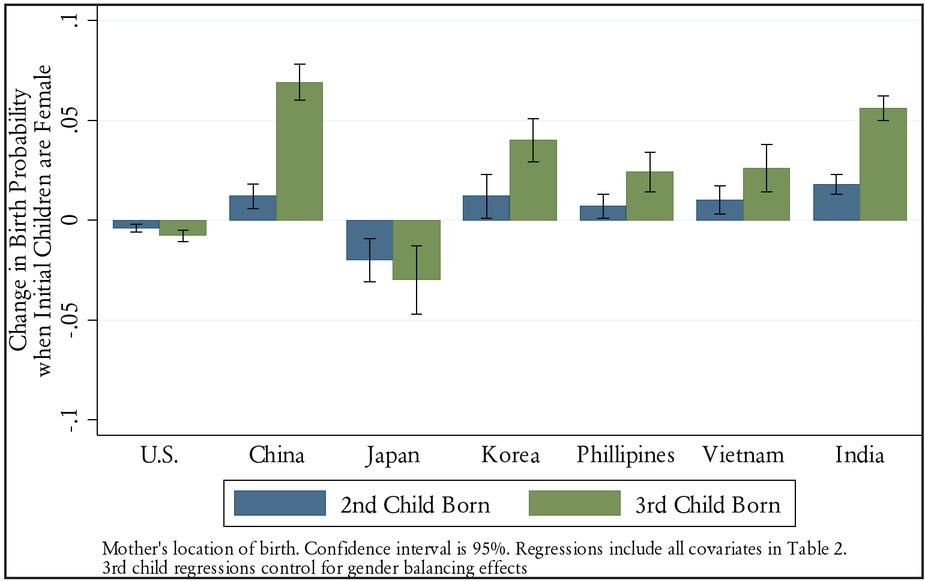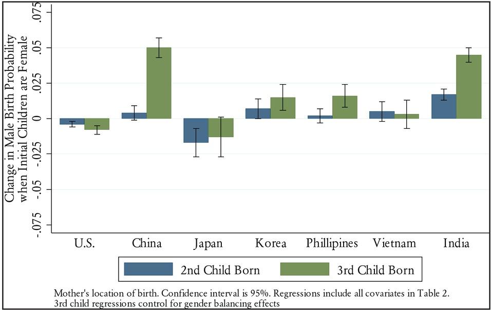 First, because we cannot discern second generation from higher-generation immigrants—one possibility is that immigrants from India in our sample are more likely to be second-generation migrants than those from other South East Asian countries such as China or Vietnam, which showed son preference in the first generation. If migrants on average from China arrived further in the past, and son preference assimilates to US norms, then the results could be a quirk of the epoch of migration different populations around the world have faced. While we cannot observe these dates in the ACS for second- and higher-order generation migrants, we can observe the average year of migration for first-generation migrants. This value is 1995 for Vietnam, 1998 for Korea, 1999 for the Philippines, 2002 for China and Japan, and 2004 for India, which is not decisively supportive evidence of this explanation for the patterns we observe.