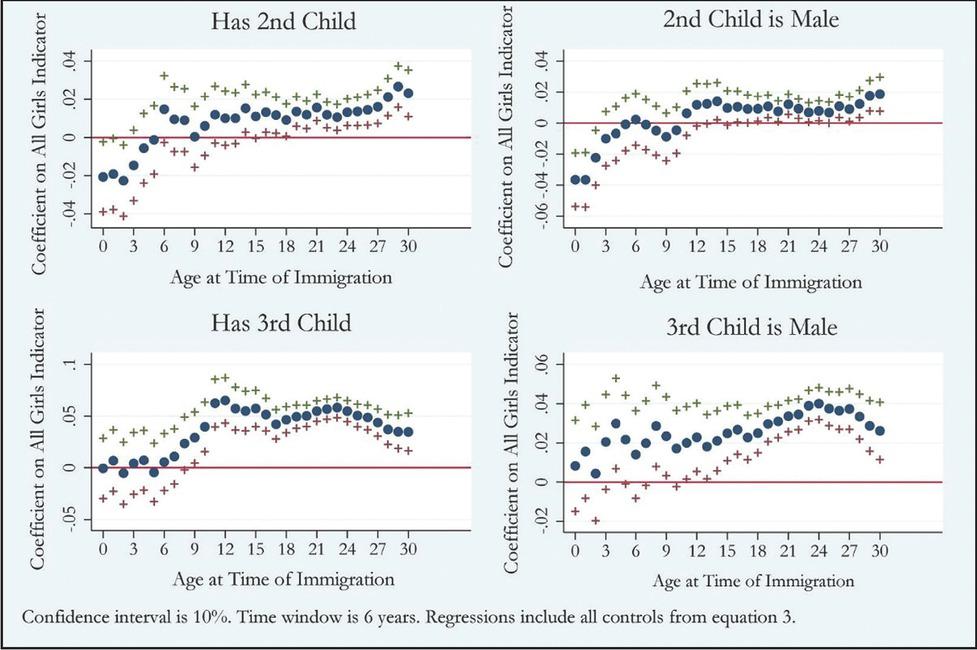 The implications of this test can be most clearly seen in the two left panels of Figure 2, which flexibly plots regression adjusted coefficient estimates on all girls across mothers’ age of migration within first-generation immigrants from SESE Asian countries.(22) In these plots, having only daughters is not significantly associated with an increase in fertility for mothers who migrated at very young ages to the United States. However, starting around an age of migration of 8 or 9, the coefficients begin to increase and by age 10 there is a statistically significant increase in fertility among mothers whose first child or first two children are daughters.