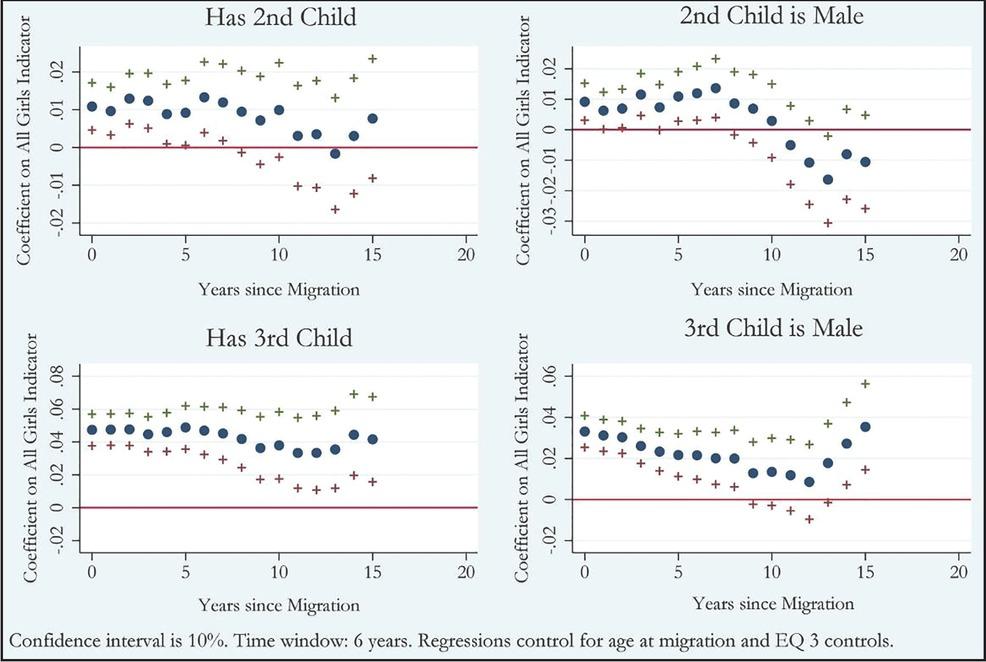 Figures 2 and 3 plot the coefficient of interest on the basis of individual age of migration in an effort to shed light on when son preference is formed and whether it is persistent. For each graph, we run a sequence of regressions using a moving window for a sample of migrants within 6 years (3 years on either side of each age). We then store the specified coefficients and SE from the model for each sample that are then plotted in the figures.